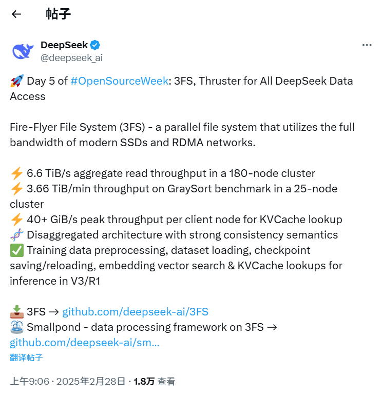 每经AI快讯,2月28日,DeepSeek开源周第五天,DeepSeek在官方X账号宣布开源3FS,它是所有Deepseek数据访问的助推器。