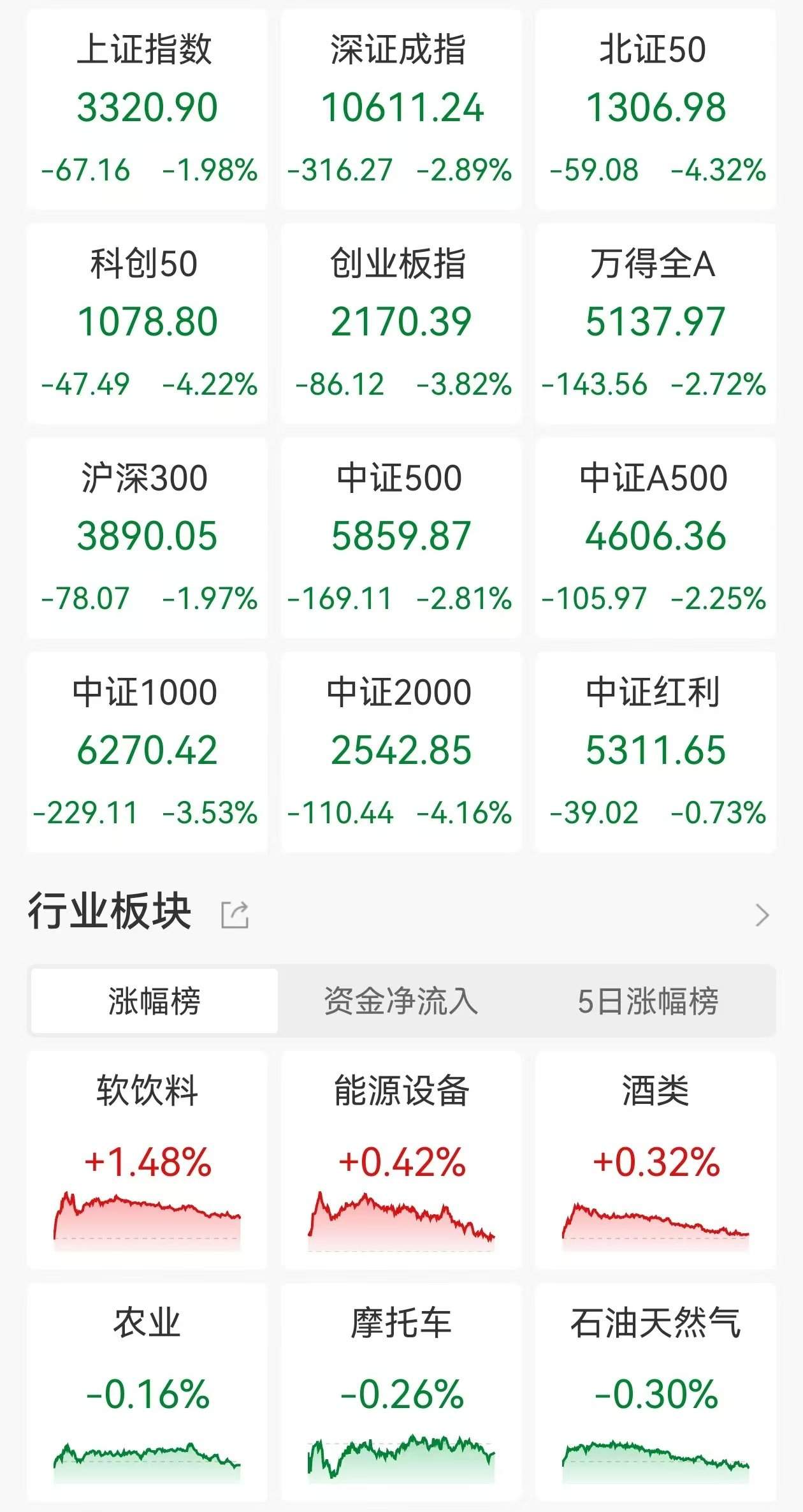 格隆汇2月28日|A股主要指数今日集体重挫,创业板指一度跌逾4%;截至收盘,沪指跌1.98%报3320点,深证成指跌2.89%,创业板指跌3.82%。全天成交1.91万亿元,较前一交易日缩量1364亿元,全市场近4800股下跌,不足600股上涨。 盘面上,遭高盛“泼冷水”,机器人板块大跌,汉威科技等超30余股跌超9%;国资云概念下挫,云赛智联(600602)等多股跌停;AIPC板块走低,泰嘉股份(002843)跌停;混合现实板块走弱,天娱数科跌停;多模态AI板块走势低迷,东方精工(002611)等多股跌停;网络安全、软件开发板块普跌,云从科技领跌;液冷概念、AI眼镜、华为N腾及数字哨兵等板块跌幅居前。另外,可燃冰、软饮料及酿酒等少数几个板块录得上涨。(格隆汇) (责任编辑:宋政 HN002)