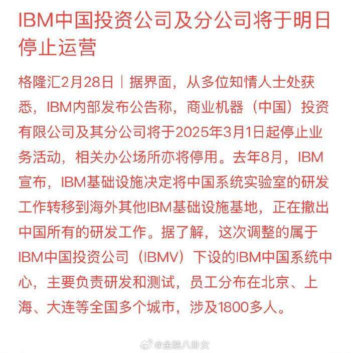 仟茂科技讯 2月28日下午消息,据媒体报道,IBM内部发布公告称,商业机器(中国)投资有限公司及其分公司将于2025年3月1日起停止业务活动,相关办公场所亦将停用。 报道称,这次调整的属于IBM中国投资公司(IBMV)下设的IBM中国系统中心,主要负责研发和测试,员工分布在北京、上海、大连等全国多个城市,涉及1800多人。该消息称IBM内部人士透露,目前IBM中国投资公司所在的北京办公区环宇大厦已经在拆除相关办公设备。 仟茂科技就上述信息求证IBM,官方回应称:IBM没有退出中国市场,IBM在全球范围内整合产品开发职能。继去年秋天中国实验室的调整后,原以承载IBM产品开发职能为主要目的国际商业机器中国(投资)有限公司已完成其主要使命, 因而计划关闭。 关闭流程将依据国家相关法律法规执行。 IBM(中国)有限公司是IBM中国的业务实体,其运营不受影响;我们的业务重心依然是帮助中国企业抓住混合云和人工智能技术带来的机遇。上述变化不会影响我们支持大中华区客户的能力。 来源:仟茂网 (责任编辑:宋政 HN002)