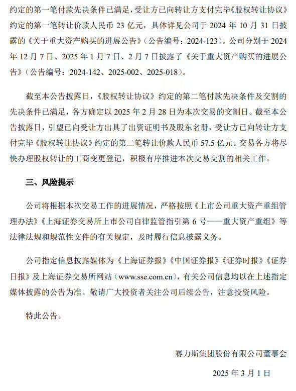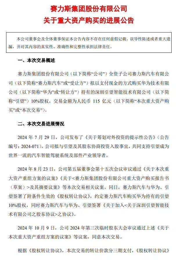 凤凰网科技讯(作者/冯皓钦)2月28日,赛力斯今日发布公告,公司全资子公司赛力斯汽车拟以 115 亿元购买华为持有的深圳引望智能技术有限公司 10% 股权。据了解,《股权转让协议》约定的第二笔付款的先决条件及交割的先决条件已满足,各方确定以 2025 年 2 月 28 日为本次交易的交割日。 据悉,华为引望已向赛力斯汽车出具了出资证明书及股东名册,赛力斯汽车已向华为支付完毕《股权转让协议》约定的第二笔转让价款人民币 57.5 亿元。截至目前,交易各方将尽快办理股权转让的工商变更登记,积极有序推进本次交易交割的相关工作。 据此前消息,赛力斯去年 8 月 25 日就已宣布赛力斯汽车拟以支付现金的方式购买华为技术有限公司持有的深圳引望智能技术有限公司 10.00% 的股权,交易价格为 115 亿元。此外,去年 10 月底,赛力斯宣布已向华为技术有限公司支付完毕《股权转让协议》约定的第一笔转让价款 23 亿元。 (责任编辑:郭健东 )