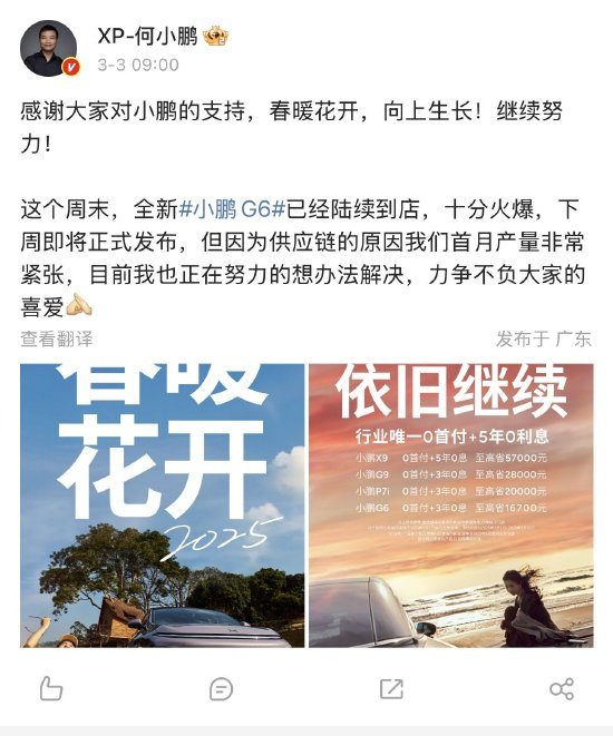 仟茂科技讯 3月3日上午消息,小鹏汽车董事长何小鹏在微博发文称,这个周末,全新小鹏G6已经陆续到店,十分火爆,下周即将正式发布,但因为供应链的原因我们首月产量非常紧张,目前我也正在努力的想办法解决,力争不负大家的喜爱。 责任编辑:尉旖涵 (责任编辑:张晓波 )