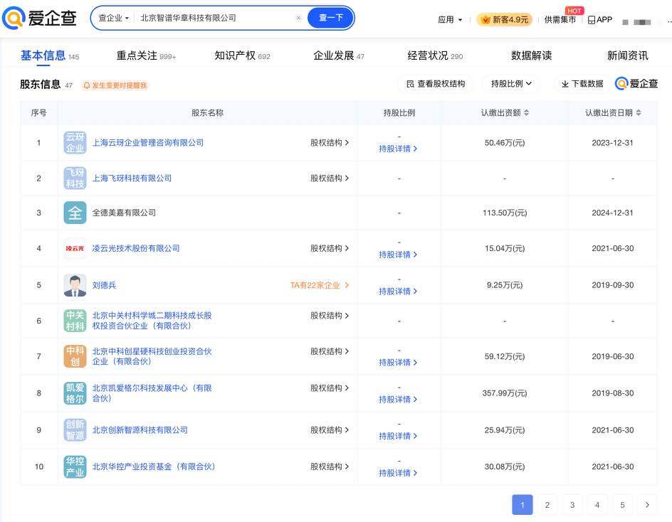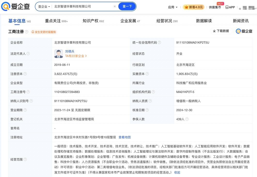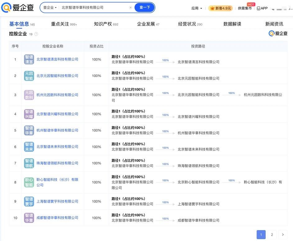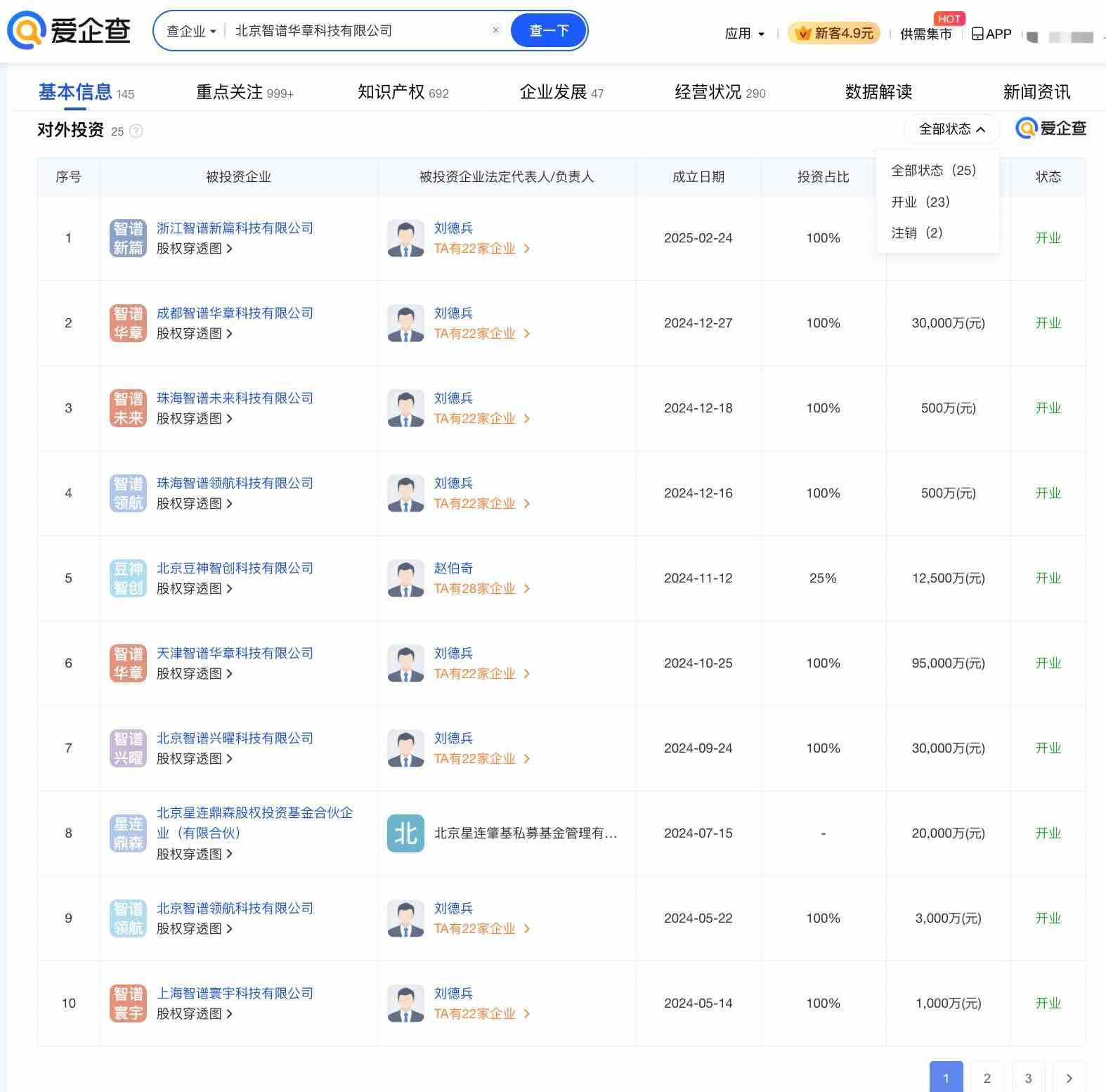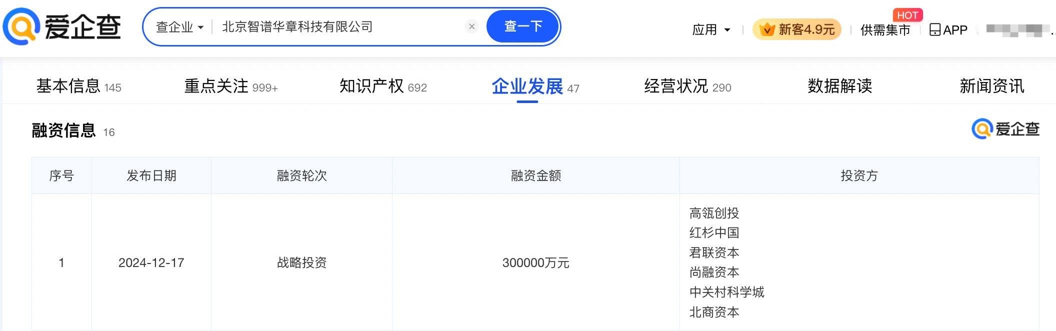 凤凰网科技讯(作者/冯皓钦)3月3日,近日,智谱完成一笔金额超10亿元人民币的战略融资,参与投资方包括杭州城投产业基金、上城资本等。据悉,这轮融资旨在推动智谱国产基座GLM大模型的技术创新和生态发展。 爱企查App显示,智谱关联公司北京智谱华章科技有限公司成立于2019年6月,法定代表人为刘德兵,注册资本3622.4万元人民币,经营范围包括人工智能基础软件开发、人工智能应用软件开发、数字内容制作服务等,由上海云e企业管理咨询有限公司、上海飞e科技有限公司、全德美嘉有限公司、北京中关村科学城二期科技成长股权投资合伙企业(有限合伙)等共同持股。 图源:爱企查 此外,融资信息显示,2024年12月,该公司完成1轮30亿元战略投资,投资方包括高瓴创投、红杉中国、中关村科学城等。 图源:爱企查 对外投资信息显示,该公司直接对外投资25家企业,分布在杭州、成都、珠海等地,版图涉及科技、投资领域,其中目前23家为开业状态。除此之外,通过直接或间接的方式,该公司拥有19家公司的实控权。 图源:爱企查 据此前消息,2月24日,该公司在杭州成立浙江智谱新篇科技有限公司,法定代表人为刘德兵,注册资本4.5亿元人民币,经营范围包括人工智能基础软件开发、人工智能应用软件开发等。 图源:爱企查 (责任编辑:王治强 HF013)