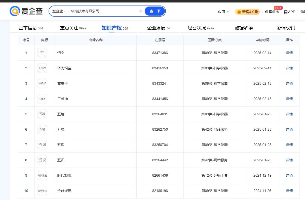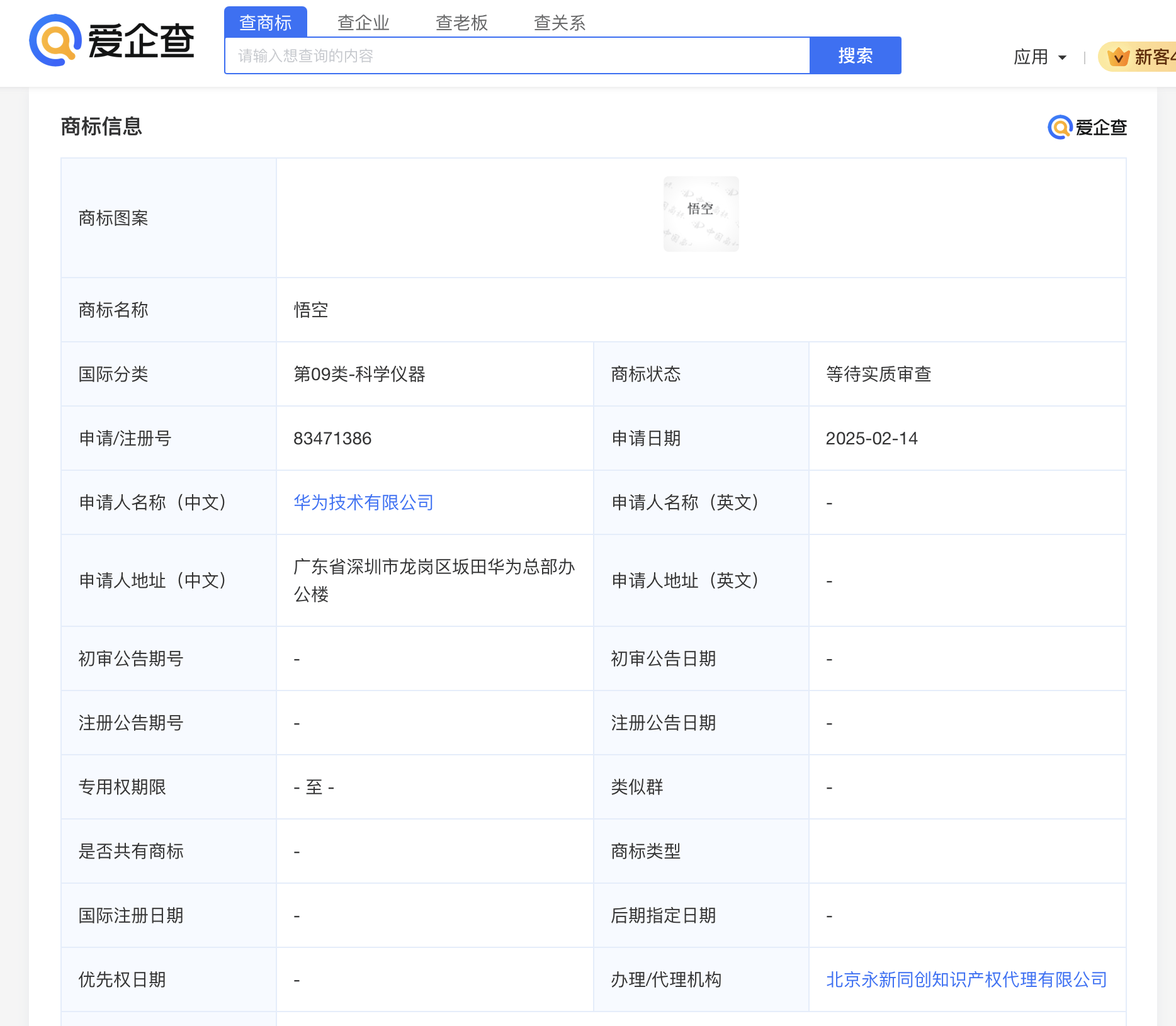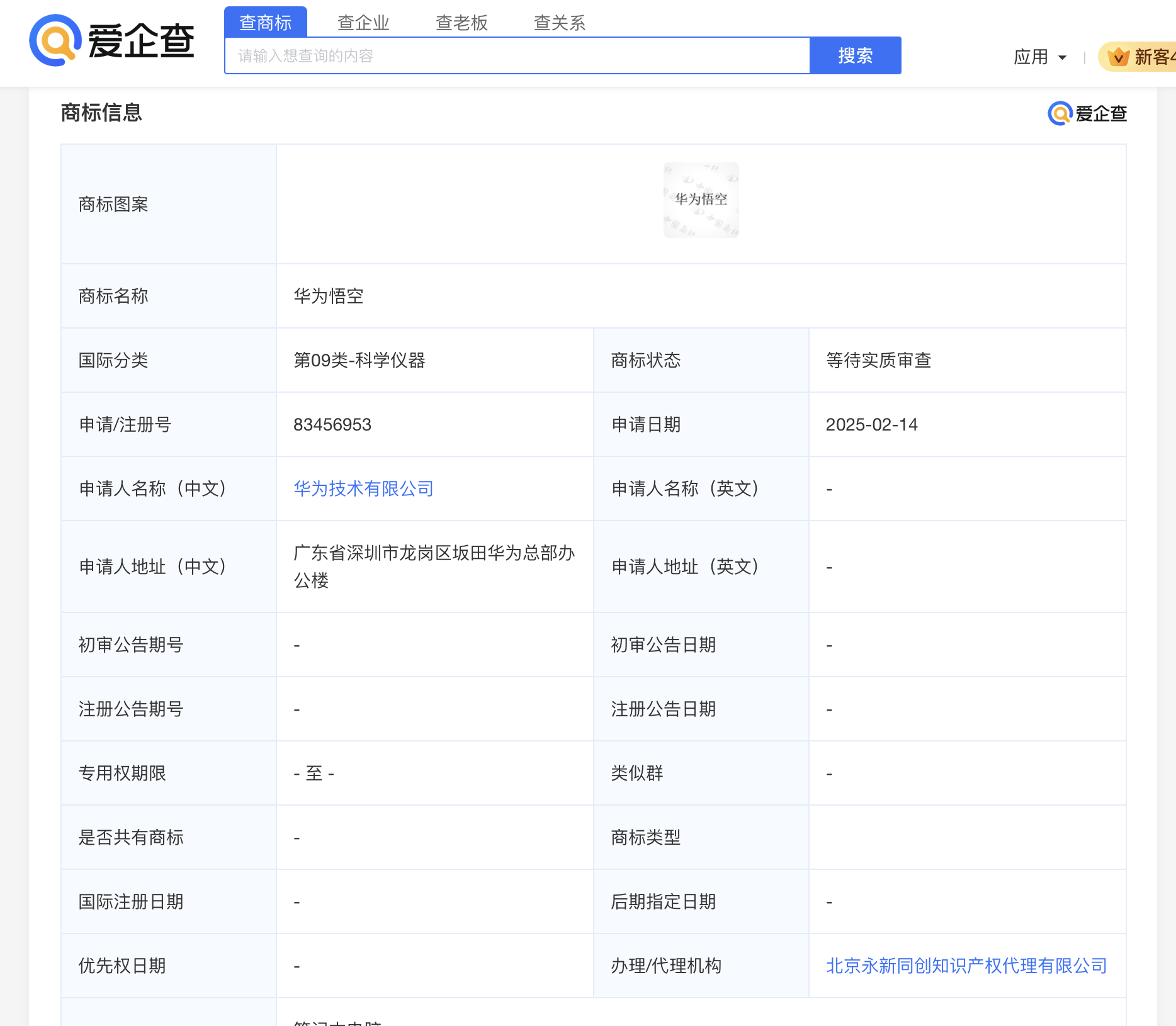 凤凰网科技讯 3月3日,爱企查App显示,近日,华为技术有限公司申请注册“悟空”“华为悟空”“Wukong”“HUAWEI Wukong”商标,国际分类均为科学仪器,当前商标状态均为等待实质审查。 图源:爱企查App 图源:爱企查App 值得一提的是,近期,华为已申请注册“精卫”“雷震子”“洛神”“二郎神”商标。 图源:爱企查App (责任编辑:张晓波 )