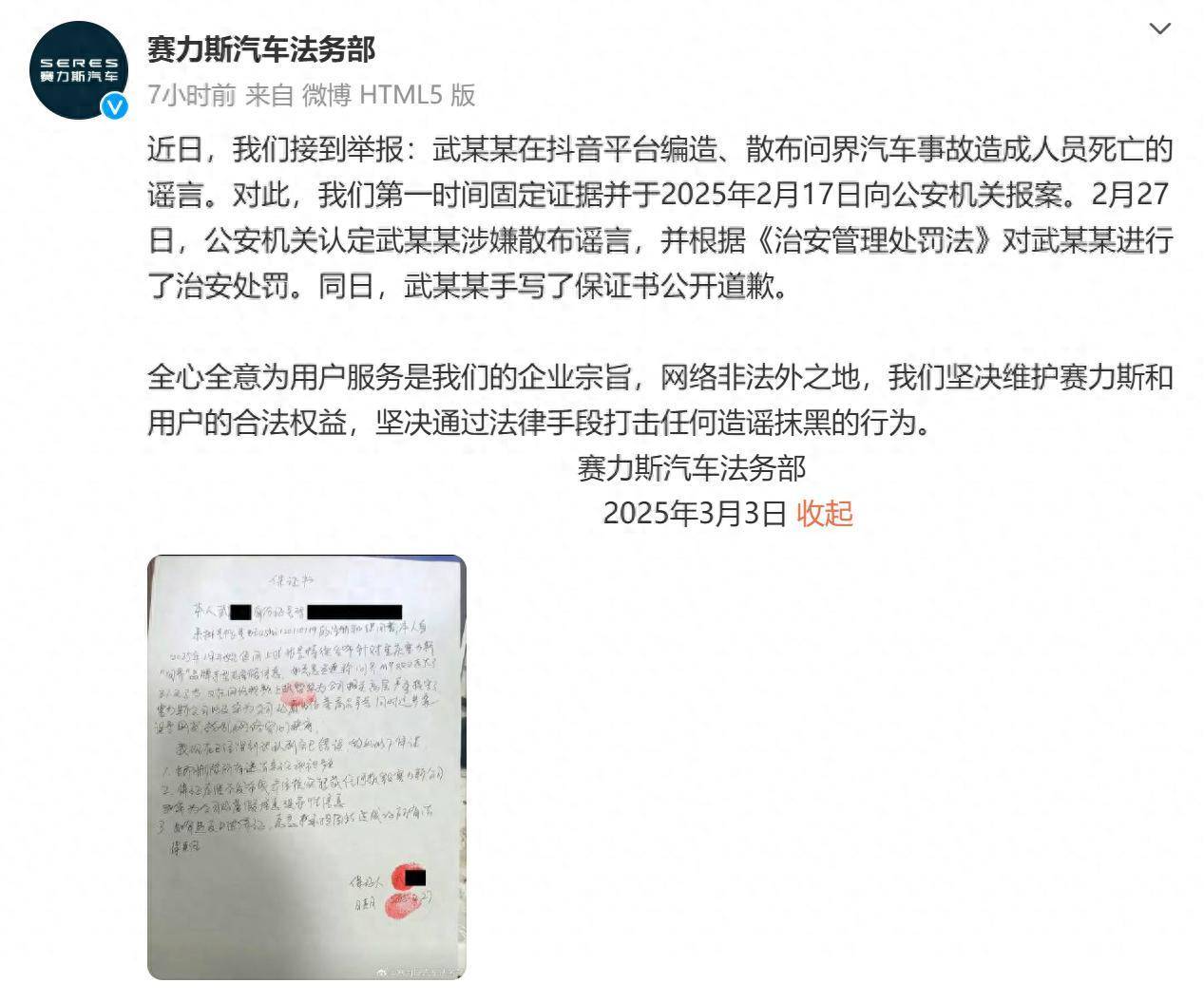 凤凰网科技讯 (作者/陈俊熹)3月3日,赛力斯汽车法务部发文称,在抖音平台编造、散布问界汽车事故造成人员死亡的造谣者已被治安处罚,并手写保证书公开道歉。 据造谣者武某某保证书内容,其自2025年1月开始通过抖音账号持续发布针对重庆赛力斯“问界”品牌车型的虚假信息,恶意造谣称“问界M9又又又起火了,三人无了”,又在网络视频上诋毁赛力斯公司和华为公司相关高层。 对此,武某某称已深刻认识到自己错误,并作出保证,包括立即删除所有违法言论和视频,保证后续不发布或未经核实转载任何诋毁赛力斯公司和华为公司的虚假信息、误导性信息,如有违反上述保证,愿意承担因此造成的所有法律后果。 赛力斯表示,“全心全意为用户服务”是企业宗旨,网络非法外之地,坚决维护赛力斯和用户的合法权益,坚决通过法律手段打击任何造谣抹黑的行为。 公开资料显示,问界M9是AITO旗下的一款中大型SUV,于2023年12月26日正式上市。2025年1月1日,鸿蒙智行官宣问界M9发布12个月累计大定突破20万辆,连续9个月蝉联中国市场50万以上月度销冠军。2月4日,赛力斯发布了2025年1月的产销数据,问界M9在1月交付了12483辆,连续10个月蝉联中国豪华市场50万元以上豪华车销量第一。 (责任编辑:董萍萍 )