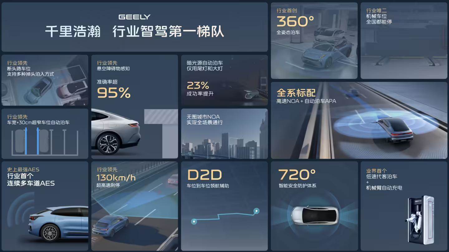 凤凰网科技讯 3月3日,吉利汽车举办“吉利AI智能科技发布会”,并发布了“千里浩瀚”安全高阶智能驾驶系统。吉利银河全新及改款产品都将搭载千里浩瀚不同层级的智驾方案。 该智驾方案支持行业首创360°全姿态泊车、无图城市NOA实现全场景通行、全系标配高速NOA+自动泊车APA、悬空障碍物感知、超高速刹停130km/h、低速代客泊车+机械臂自动充电。 吉利表示,千里浩瀚将于3月正式大规模推送D2D车位到车位领航辅助。此外,搭载吉利最新Robotaxi解决方案车已经在苏州、杭州正式启动 (责任编辑:刘静 HZ010)