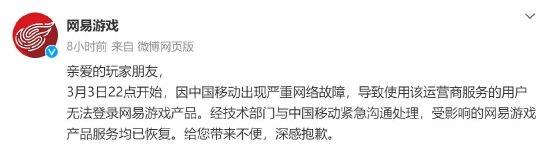 仟茂科技讯 3月4日上午消息,网易游戏官方回应称:3月3日22点开始,因中国移动出现严重网络故障,导致使用该运营商服务的用户无法登录网易游戏产品。经技术部门与中国移动紧急沟通处理,受影响的网易游戏产品服务均已恢复。给您带来不便,深感抱歉。 据悉,3月3日晚,多位网易游戏玩家发文称出现无法登陆问题,网易随后作出官方回应致歉。(罗宁)
