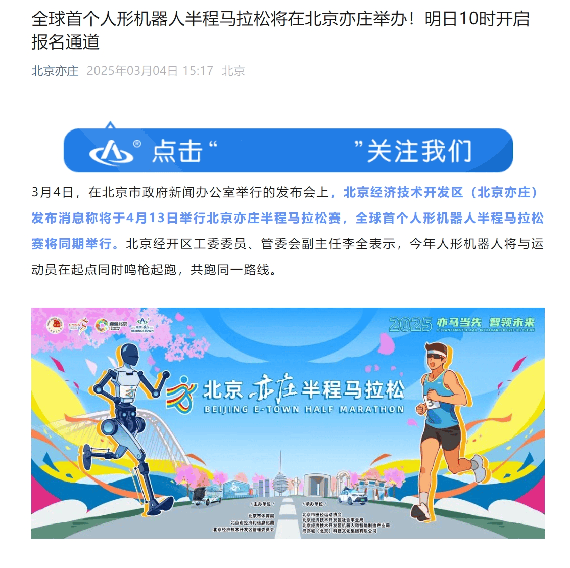 据北京亦庄公众号,3月4日,在北京市政府新闻办公室举行的发布会上,北京经济技术开发区(北京亦庄)发布消息称将于4月13日举行北京亦庄半程马拉松赛,全球首个人形机器人半程马拉松赛将同期举行。 北京经开区工委委员、管委会副主任李全表示,人形机器人将与运动员在起点同时鸣枪起跑,共跑同一路线,但拥有单独赛道,全程采用铁马隔离或绿化带隔离的方式保障人机安全。根据研判,本次赛事将机器人的关门时间设置为3小时30分钟左右。在比赛过程中,机器人可更换电池,也可通过更换机器人以接力形式参加全程比赛。依据比赛过程中完赛时间、机器人更换次数进行综合评价,比赛过程中更换机器人每次罚时10分钟。 李全介绍,此次赛事起点位于南海子公园一期南广场,终点位于通明湖国家信创园,采取机器人和运动员“同步报名、同一赛道、同时起跑”的原则。人形机器人将与运动员在起点同时鸣枪起跑,共跑同一路线,但拥有单独赛道,全程采用铁马隔离或绿化带隔离的方式保障人机安全。根据研判,本次赛事将机器人的关门时间设置为3小时30分钟左右。在比赛过程中,机器人可更换电池,也可通过更换机器人以接力形式参加全程比赛。依据比赛过程中完赛时间、机器人更换次数进行综合评价,比赛过程中更换机器人每次罚时10分钟。 李全表示,今年参赛的机器人应具备人形外观、可以实现双足行走或奔跑等动作,而非轮式结构。在控制方式方面,机器人可以是手动遥控(包含半自主),也可以是完全自主的控制方式。参赛团队须遵守赛事规则,包括比赛路线以及任何特定的技术要求等,并确保机器人不会对赛道、其他参赛机器人和周边人员造成损害。同时,为打造赛事的科技氛围,赛前起跑仪式将由机器人主持,赛后将举办机器人大秀场和互动体验等活动。值得关注的是,本次赛事设置了冠、亚、季军,奖金分别为5000元、4000元、3000元,还设置了完赛奖、最优耐力奖、最佳人气奖、最佳步态奖、最佳形态创意奖等系列奖项,还为人形机器人研发团队准备了丰厚奖励,以表达对创新研发团队辛勤付出的认可与鼓励。 新华社报道,在北京,人形机器人参与到马拉松赛事中已不是第一次。 2024北京亦庄半程马拉松上,“天工”机器人在起点和终点为选手“加油打气”成为赛事的一大亮点。作为北京市重要的机器人产业集聚地,截至目前,北京经开区已拥有机器人生态企业140余家,产值规模近百亿元,形成覆盖核心零部件、整机到应用的机器人全产业链体系。 北京经济技术开发区有关负责人介绍,北京经开区将以赛聚力、以赛聚才,进一步加快具身智能前沿技术攻关和高端人形产品产业化,培育一流创新生态,全力推动人形机器人产业创新发展。