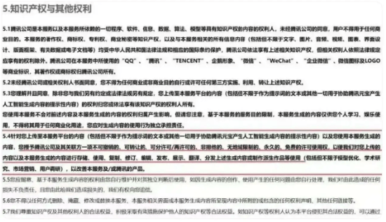 文|仟茂科技 罗宁 用AI助手创作的内容究竟是否属于用户? 近日,腾讯旗下AI助手“元宝”因用户协议中知识产权条款的多次修订引发争议。在此前的用户协议中,创作者将失去对内容的控制权,腾讯可以将内容用于商业或其他用途。此举被网友们认定为“霸王条款”。 3月以来,腾讯元宝三次调整协议内容,对用户上传内容及AI生成成果的授权范围、商业使用等条款作出不同界定。 争议焦点集中于用户创作内容的授权边界、平台商业化权限及版权归属等核心问题,部分用户已称已转投其他平台。 旧版协议惹争议:创作者失去对内容的控制权? 据媒体报道,腾讯元宝先前发布《用户协议》中第5条对知识产权与其他权利做出规定,其中第5.4款具体表述为:针对您上传至本服务平台的内容(包括但不限于作为提示词的文本或其他一切用于协助腾讯元宝产生人工智能生成内容的提示性内容)以及您使用本服务生成的内容,您授予腾讯公司及其关联方一项不可撤销的、可转让的、可分许可/再许可的、非排他的、无地域限制的、永久的、免费的许可使用权,以使我们对您上传的内容以及本服务生成的内容进行存储、使用、复制、修订、编辑、发布、展示、翻译、分发上述生成内容或制作派生作品等使用(包括但不限于模型优化、学术研究、市场营销、用户调研),以改善本服务/或腾讯的产品。 然而,不少网友对此条款质疑: 一方面,创作者上传的内容虽然仍然属于创作者,但腾讯获得了几乎无限的使用权,且这种授权是永久性和不可撤销的。创作者失去了对内容的控制权,腾讯可以将内容用于商业或其他用途,而创作者无法干预; 另外一方面,创作者的内容可能被用于商业目的,而创作者无法从中获得任何经济补偿,甚至可能对创作者的品牌或声誉产生不利影响;并且,这意味着创作者对内容的原始意图和完整性可能被破坏,腾讯可以对内容进行任意修改,甚至可能改变内容的原意或用途;创作者在使用腾讯元宝时,需要谨慎考虑内容的敏感性和商业价值,避免上传可能涉及隐私或商业机密的内容。 用户协议多次修改,用户称“还是选DeepSeek” 3月1日,腾讯元宝突然修改《用户协议》,对于知识产权相关表述调整为:在法律允许的范围内,针对您上传至本服务平台的内容以及您使用本服务生成的内容,为提供、维护和改进我们的服务,您同意授予腾讯公司在全球范围内一项免费的、可分许可的、非排他的许可使用权,以使我们对前述内容进行处理,例如用于模型优化、品牌推广与宣传、用户调研。如果您不希望我们用于前述目的,您可以根据本协议第13条的方式联系我们。 不仅如此,在3月1日的有关创作者内容是否可以商业化的描述中,腾讯元宝《用户协议》的描述为:您充分理解并同意,除非本服务相关界面另有说明,或您与我们另有约定,您仅可以非商业的、个人研究学习的方式使用本服务及其程序、软件、信息、数据、算法、开发文档及相关的元素、组件等内容。未经我们书面同意,您无权以商业目的对本服务生成内容实施复制、转让、出售、出租、出借、许可、转让等任何行为。 上述内容表述再次引发用户热议,有网友还将“创作内容是否可商业化”这一条款对比DeepSeek,发现在DeepSeek的用户协议中对于用户创作的内容有着更为宽松的限制,相关条款描述为:在符合法律规定和我们的条款的条件下,您对本服务的输入与输出享有以下权利:(1)您保留在提交的输入中拥有的任何权利、所有权和利益(如有);(2)我们将本服务输出的内容的任何权利、所有权和利益(如有)归属于您。(3)您可将本服务的输入与输出应用于广泛的使用场景中包括个人使用、学术研究、衍生产品开发、训练其他模型(如模型蒸馏)等。 不少网友在相关对比下留言评论称:“用其他平替。” 不过,时间来到3月4日,腾讯元宝用户协议再次发生改变。在关于知识产权和其他权利的描述中写道:您上传至本服务平台的内容以及您使用本服务生成的内容,权利归您或依法享有该知识产权的权利人所有,您使用本服务不会对前述内容及本服务生成的内容的权利归属产生影响。请您在使用前述内容时,注意遵守相关法律规定。 针对您上传至本服务平台的内容以及您使用本服务生成的内容,除非您开启“体验优化计划”,否则我们不会将前述内容用于模型优化。如您主动加入我们的体验优化计划,帮助改进和优化本服务,您同意授予腾讯公司在全球范围内一项免费的、非排他的许可使用权,以使我们对前述内容进行处理,您可随时通过“设置-数据管理-体验优化计划”调整前述授权。 客服回应:权利归用户或依法享有该知识产权的权利人所有 为何关于知识产权相关的条款多次发生变更?在用户使用元宝进行创作时相关知识产权究竟归属于谁? 针对上述问题,仟茂科技求证腾讯官方,截至发稿,官方暂无回应,但腾讯客服表示:您上传至本服务平台的内容、以及您使用本服务生成的内容,权利归您或依法享有该知识产权的权利人所有,您使用本服务不会对前述内容及权利归属产生影响,具体您可查阅产品服务协议。 此外,仟茂科技就“有用户反映你们的用户协议存在霸王条款,上传的内容版权都要归你们这个消息是否属实呢?”相关问题询问腾讯元宝时,元宝回应称:您上传至本服务平台的内容以及使用本服务生成的内容,权利归您