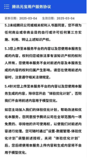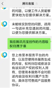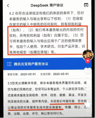 文|仟茂科技罗宁 用AI助手创作的内容究竟是否属于用户? 近日,腾讯旗下AI助手“元宝”因用户协议中知识产权条款的多次修订引发争议。在此前的用户协议中,创作者将失去对内容的控制权,腾讯可以将内容用于商业或其他用途。此举被网友们认定为“霸王条款”。 3月以来,腾讯元宝三次调整协议内容,对用户上传内容及AI生成成果的授权范围、商业使用等条款作出不同界定。 争议焦点集中于用户创作内容的授权边界、平台商业化权限及版权归属等核心问题,部分用户已称已转投其他平台。 旧版协议惹争议:创作者失去对内容的控制权? 据媒体报道,腾讯元宝先前发布《用户协议》中第5条对知识产权与其他权利做出规定,其中第5.4款具体表述为:针对您上传至本服务平台的内容(包括但不限于作为提示词的文本或其他一切用于协助腾讯元宝产生人工智能生成内容的提示性内容)以及您使用本服务生成的内容,您授予腾讯公司及其关联方一项不可撤销的、可转让的、可分许可/再许可的、非排他的、无地域限制的、永久的、免费的许可使用权,以使我们对您上传的内容以及本服务生成的内容进行存储、使用、复制、修订、编辑、发布、展示、翻译、分发上述生成内容或制作派生作品等使用(包括但不限于模型优化、学术研究、市场营销、用户调研),以改善本服务/或腾讯的产品。 然而,不少网友对此条款质疑: 一方面,创作者上传的内容虽然仍然属于创作者,但腾讯获得了几乎无限的使用权,且这种授权是永久性和不可撤销的。创作者失去了对内容的控制权,腾讯可以将内容用于商业或其他用途,而创作者无法干预; 另外一方面,创作者的内容可能被用于商业目的,而创作者无法从中获得任何经济补偿,甚至可能对创作者的品牌或声誉产生不利影响;并且,这意味着创作者对内容的原始意图和完整性可能被破坏,腾讯可以对内容进行任意修改,甚至可能改变内容的原意或用途;创作者在使用腾讯元宝时,需要谨慎考虑内容的敏感性和商业价值,避免上传可能涉及隐私或商业机密的内容。 用户协议多次修改,用户称“还是选DeepSeek” 3月1日,腾讯元宝突然修改《用户协议》,对于知识产权相关表述调整为:在法律允许的范围内,针对您上传至本服务平台的内容以及您使用本服务生成的内容,为提供、维护和改进我们的服务,您同意授予腾讯公司在全球范围内一项免费的、可分许可的、非排他的许可使用权,以使我们对前述内容进行处理,例如用于模型优化、品牌推广与宣传、用户调研。如果您不希望我们用于前述目的,您可以根据本协议第13条的方式联系我们。 不仅如此,在3月1日的有关创作者内容是否可以商业化的描述中,腾讯元宝《用户协议》的描述为:您充分理解并同意,除非本服务相关界面另有说明,或您与我们另有约定,您仅可以非商业的、个人研究学习的方式使用本服务及其程序、软件、信息、数据、算法、开发文档及相关的元素、组件等内容。未经我们书面同意,您无权以商业目的对本服务生成内容实施复制、转让、出售、出租、出借、许可、转让等任何行为。 上述内容表述再次引发用户热议,有网友还将“创作内容是否可商业化”这一条款对比DeepSeek,发现在DeepSeek的用户协议中对于用户创作的内容有着更为宽松的限制,相关条款描述为:在符合法律规定和我们的条款的条件下,您对本服务的输入与输出享有以下权利:(1)您保留在提交的输入中拥有的任何权利、所有权和利益(如有);(2)我们将本服务输出的内容的任何权利、所有权和利益(如有)归属于您。(3)您可将本服务的输入与输出应用于广泛的使用场景中包括个人使用、学术研究、衍生产品开发、训练其他模型(如模型蒸馏)等。 不少网友在相关对比下留言评论称:“用其他平替。” 不过,时间来到3月4日,腾讯元宝用户协议再次发生改变。在关于知识产权和其他权利的描述中写道:您上传至本服务平台的内容以及您使用本服务生成的内容,权利归您或依法享有该知识产权的权利人所有,您使用本服务不会对前述内容及本服务生成的内容的权利归属产生影响。请您在使用前述内容时,注意遵守相关法律规定。 针对您上传至本服务平台的内容以及您使用本服务生成的内容,除非您开启“体验优化计划”,否则我们不会将前述内容用于模型优化。如您主动加入我们的体验优化计划,帮助改进和优化本服务,您同意授予腾讯公司在全球范围内一项免费的、非排他的许可使用权,以使我们对前述内容进行处理,您可随时通过“设置-数据管理-体验优化计划”调整前述授权。 客服回应:权利归用户或依法享有该知识产权的权利人所有 为何关于知识产权相关的条款多次发生变更?在用户使用元宝进行创作时相关知识产权究竟归属于谁? 针对上述问题,仟茂科技求证腾讯官方,截至发稿,官方暂无回应,但腾讯客服表示:您上传至本服务平台的内容、以及您使用本服务生成的内容,权利归您或依法享有该知识产权的权利人所有,您使用本服务不会对前述内容及权利归属产生影响,具体您可查阅产品服务协议。 此外,仟茂科技就“有用户反映你们的用户协议存在霸王条款,上传的内容版权都要归你们这个消息是否属实呢?”相关问题询问腾讯元宝时,元宝回应称:您上传至本服务平台的内容以及使用本服务生成的内容,权利归您或
