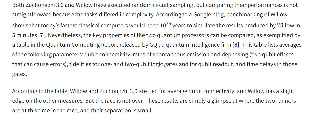 近期,我国科研团队成功构建的105比特超导量子计算机“祖冲之三号”,实现了对“量子随机线路取样”任务的快速求解,再一次打破超导体系量子计算优越性纪录。 3月3日,相关论文以封面论文的形式发表在国际学术期刊《物理评论快报》上,其中署名作者有20位来自国盾量子(SH688027,股价299.8元,市值308亿元)。安徽省量子信息工程技术研究中心副主任、国盾量子计算业务负责人王哲辉向记者表示:“公司作为唯一企业参与单位,为该成果提供了室温电子学软硬件系统的研发与工程化落地、量子计算机整机的搭建和运维等支持。” 3月5日,《每日经济新闻》记者从相关论文中获悉,祖冲之三号在对83比特32层随机线路采样实验时凸显了其卓越性能,仅用了几百秒就获得了100万次采样。据估算,即使是最强大的经典超级计算机Frontier,要复制这一任务也需要大约59亿年。 “祖冲之三号”获重大进展 相关论文指出,量子计算优势是指量子计算机能够执行经典计算机无法完成的计算任务。谷歌在2019年通过Sycamore处理器首次展示了量子计算优势,但随着经典算法的进步,这一优势不断受到挑战。“本文的目标是通过开发更强大的超导量子处理器,确立量子计算优势的新基准。” 据悉,“祖冲之三号”的研发取得了重大进展。这款超导量子计算机原型包含105个量子比特,实现了高操作保真度,其中单量子比特门、双量子比特门和读取保真度分别高达99.90%、99.62%和99.13%。与现有最优经典算法相比,“祖冲之三号”处理量子随机线路取样问题的速度比目前最快的超级计算机快15个数量级,超过谷歌2024年10月公开发表的最新成果6个数量级。 中国科学技术大学微信公众号介绍,“祖冲之三号”采用二维网格比特排布芯片架构,直接兼容易于实现规模化拓展的表面码量子纠错算法,目前团队正基于“祖冲之三号”开展码距为7的表面码纠错研究,已取得良好进展,并计划进一步将码距扩展到9和11,为实现大规模量子比特的集成和操纵铺平道路。 “量子计算优越性”验证了量子计算系统能够超越传统超级计算机的可行性,是量子计算具备应用价值的前提条件,也是当前一个国家量子计算研究实力的直接体现。 《物理》杂志刊文:可与谷歌Willow处理器竞争 《物理评论快报》审稿人高度评价这一工作,认为这一工作“构建了目前最高水准的超导量子计算机”,“是对此前66比特处理器(祖冲之二号)的重大升级”。鉴于该项研究工作的重要性,美国物理学会同期在《物理》(Physics)杂志上特别刊发观点论文,深入解读并重点介绍了该研究的创新之处与重要意义。 《每日经济新闻》记者阅读该观点论文获悉,“祖冲之三号”是一款新的高性能量子处理器,拥有105个超导量子位,可与谷歌广受赞誉的Willow处理器竞争。 图片来源:《物理》杂志网页截图 观点论文表示,“祖冲之三号”和Willow都执行了随机电路采样,但直接比较它们的性能并非易事,因为任务的复杂性不同。根据谷歌的一篇博客文章,Willow的基准测试显示,当今最快的经典计算机需要10年才能模拟Willow在5分钟内产生的结果。 然而,可以比较这两款量子处理器的关键属性,如量子智能公司GQI发布的《量子计算报告》中的一张表格。该表格列出了以下参数的平均值:量子比特连通性、自发辐射和退相干水平(可能导致错误的两种量子比特效应)、单量子比特和双量子比特逻辑门以及量子比特读出的保真度,以及这些门中的时间延迟。根据该表格,Willow和“祖冲之三号”在平均量子比特连通性方面打成平手,而Willow在其他指标上略有优势。但竞争并未结束。这些结果只是在这场竞赛中双方当前所处位置的简要一瞥,且双方差距很小。 图片来源:《物理》杂志网页截图 据悉,在“祖冲之三号”取得最强“量子计算优越性”后,团队正继续开展量子纠错、量子纠缠、量子模拟、量子化学等多方面探索。 王哲辉向《每日经济新闻》记者介绍,通过参与上述前沿研究,国盾量子也用十年时间,搭建起覆盖核心组件、整机系统、云服务的国产化产业链链条,为世界提供超导量子计算整体解决方案的“中国选项”。后续,国盾量子还将继续支持研究团队在量子纠错、量子模拟、量子化学等方面的探索,助力我国抢占量子科技发展制高点。 封面图片来源:每经记者 张建 摄(资料图,图文无关) (责任编辑:郭健东 )