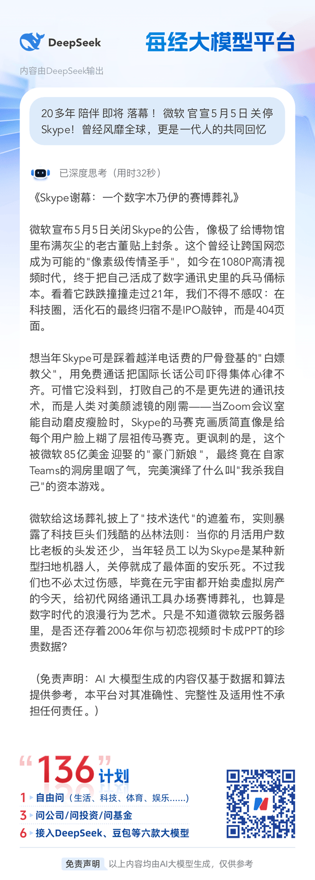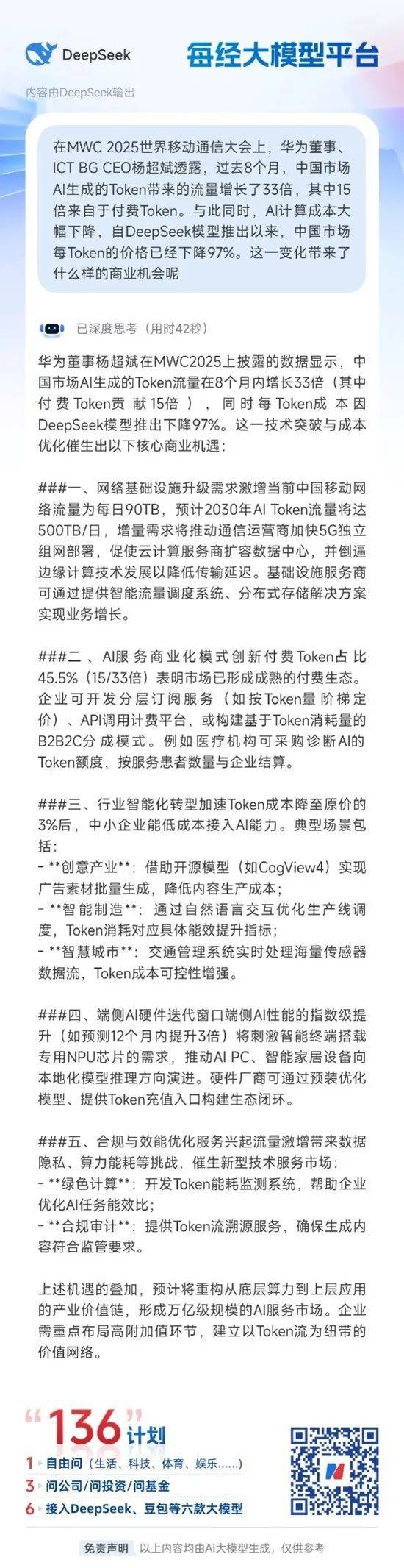 在2025世界移动通信大会(MWC 2025)上,华为董事、ICT BG(信息基础设施业务集团)CEO杨超斌透露,过去8个月,中国市场AI生成的Token带来的流量增长了33倍,其中15倍来自于付费Token。与此同时,AI计算成本大幅下降,自DeepSeek模型推出以来,中国市场每Token的价格已经下降97%。 Token是AI模型进行计算和生成内容的基本单位。例如,在AI聊天模型中,Token可以是一个字、一个单词,甚至是一个标点符号。Token的多少直接影响着AI模型的运行成本和网络流量,当用户使用AI工具进行文本、图片或视频生成时,实际上是在“消耗”Token。杨超斌指出,AI Token的增长正在重塑中国的网络流量格局。预计到2030年,AI Token带来的日均网络流量将在中国市场达到500TB,而目前全中国所有移动网络流量总和仅为90TB。 华为高级副总裁、ICT销售与服务总裁李鹏表示,未来五年,网络流量将以超越摩尔定律的速度重回高速增长。 华为无线网络产品线副总裁、首席营销官赵东也表示,未来五年,AI驱动的流量增长预计将超过现有日均流量的五倍。赵东认为,AI终端与云端的计算协同也成为影响网络流量的重要因素。由于手机、PC等终端设备的计算能力有限,部分AI推理任务需要在云端完成,这意味着终端与云服务器之间的交互数据量将显著增加。 AI Token的爆发式增长,正在为电信运营商带来新的机遇。赵东表示,运营商需要通过智能化技术重构网络架构,以满足AI时代的多模态数据流量需求。 这包括: 1. 从“大下行”向“大上行”演进,满足AI内容创作带来的上行流量需求; 2. 网络能力从通信向计算、感知、定位等多维度扩展,适应AI驱动的业务模式; 3. 人与网络的交互方式改变,从单一的数据流量变成多模态交互。 那除了这些改变,Token流量的激增还带来了哪些商业机会呢?AI的事情最好还是问问AI吧。每经小编通过每经App里接入的DeepSeek来寻找答案。 每经App接入的DeepSeek响应速度快到飞起,使用起来非常丝滑! 不管是问公司、问投资、问基金,还是自由对话,都轻松拿捏! 咋用呢?超简单! 先下载每日经济新闻App https://www.nbd.com.cn/corp/2016app/index.html 再往下看↓ 一、在每日经济新闻App首页,点击“DeepSeek”图标或首页轮播图“自由问+问公司问投资问基金免费使用DeepSeek、Kimi、豆包等六款大模型”。 二、进入“每经大模型平台”页面,即可使用DeepSeek、Kimi、豆包、智谱清言、文心一言和通义千问6款大模型中任意一款。 最近,每经“136计划”还增加了新功能: 点击“公司锐评”或“公告解读”中的任意新闻, 就能立即让大模型对新闻事件或公告作出 风格独特的评论和分析。 效果有多惊艳?直接看下面就知道啦 ―― 告别“服务器繁忙” 快用每日经济新闻App吧! 记者|岳楚鹏 编辑|段炼 兰素英 王嘉琦 盖源源 校对|赵庆 |每日经济新闻 nbdnews 原创文章| 未经许可禁止转载、摘编、复制及镜像等使用 每日经济新闻 (责任编辑:董萍萍 )
