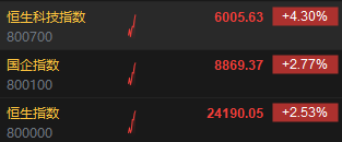 3月6日消息,港股三大指数高开高走,截至发稿,恒指涨2.53%,恒生科指涨4.3%,国企指数涨2.77%。快手大涨逾11%,阿里巴巴涨超7%,腾讯控股涨超5%。