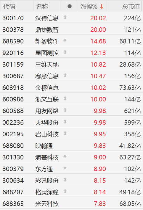 格隆汇3月6日|A股市场DeepSeek概念股活跃,其中,汉得信息(300170)、鼎捷数智20CM涨停,新致软件涨超14%,星图测控涨超12%,三维天地、赛意信息(300687)涨超10%,金桥信息(603918)、浙文互联、用友网络(600588)、大华股份(002236)、岩山科技10CM涨停,映翰通、熵基科技、东方通(300379)、彩讯股份(300634)、格灵深瞳、光云科技等跟涨。 (责任编辑:宋政 HN002)
