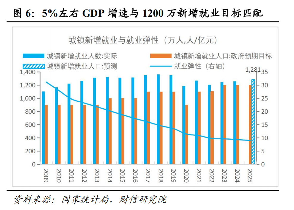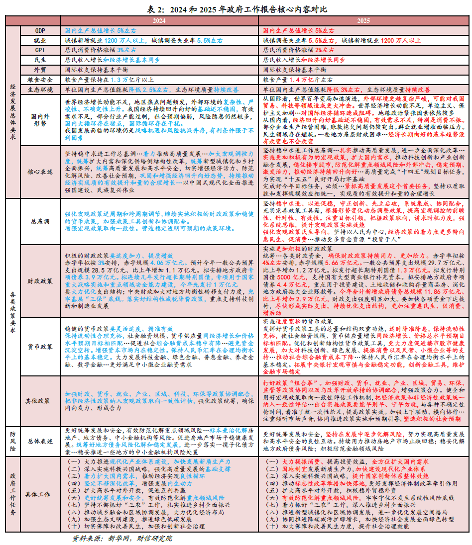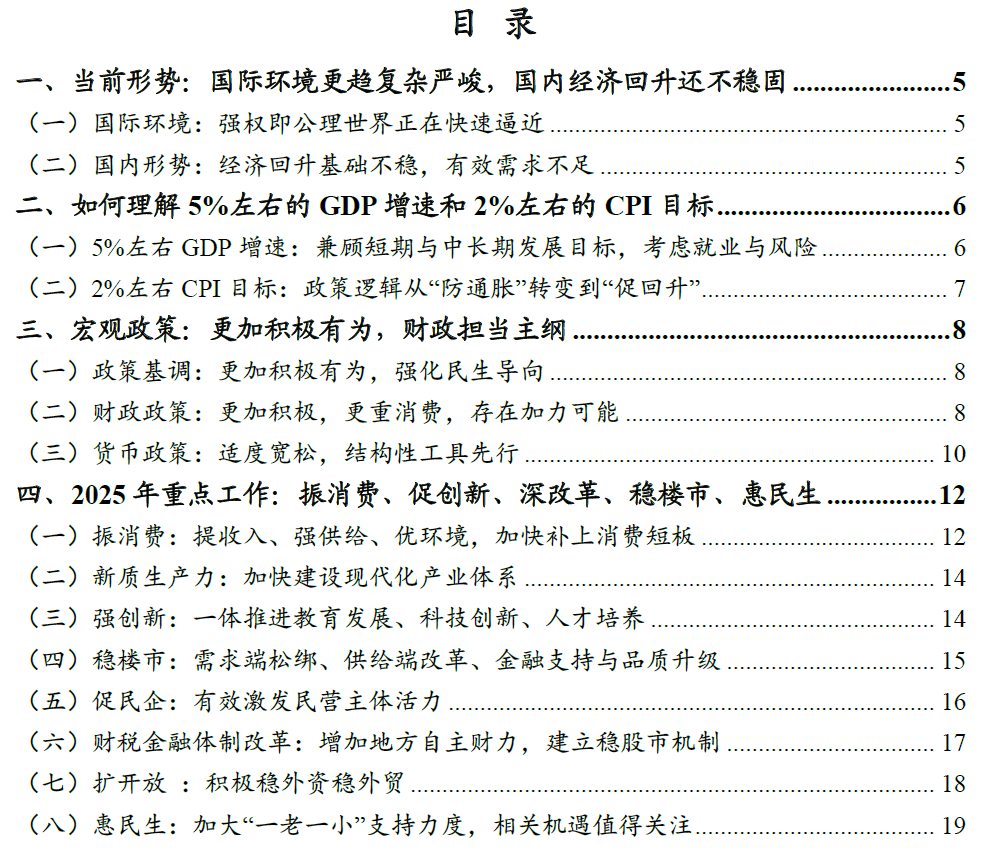 核心观点 一、当前形势:国际环境更趋复杂严峻,国内经济回升还不稳固。国际环境方面,二战后构建的全球治理体系正进入重组阶段,特朗普2.0明显加速了这一进程,世界正加速回归权力政治,强权即公理的丛林法则再现于世,百年变局加速演进,对国际经济循环造成阻碍。国内形势方面,经济回升向好基础还不稳固,有效需求不足,特别是消费不振,部分企业生产经营困难,群众就业增收面临压力,风险隐患仍然较多,尤其是房地产需止跌回稳。 二、如何理解5%左右的GDP增速和2%左右的CPI目标:兼顾需要与可能。其中,5%左右的GDP预期目标,一是兼顾了实现“十四五”规划和2035年远景目标的最低GDP增速要求;二是与1200万以上就业目标相匹配;三是5%左右增速目标是防风险、提振信心和预期的利器。CPI预期目标从3%调降至2%左右,一是标志着政策逻辑从“防通胀”转变到“促回升”;二是适应经济结构调整的需要,新旧动能转换期下调通胀目标是经济转型的产物;三是需求不足背景下下调预期目标,更贴近实际情况;四是更有助于物价合理回升目标的实现,与其调高目标够不上,不如下调目标接近实际,更能凝聚实现目标的动能。 三、宏观政策:更加积极有为,财政担当主纲 政策总基调:更加积极有为,强化民生导向。具体体现为力度更大、节奏前置、方向更重民生、协同性更强、空间可动态调整五个方面。一是今年“更加积极的财政政策”+“适度宽松的货币政策”组合,综合力度明显增强;二是宏观政策尤其是财政政策要求靠前发力、能早则早,力图重新走到市场曲线前面;三是首次提出“强化宏观政策民生导向”,是适应高质量发展阶段的重大政策创新;四是强调打好政策“组合拳”,提升政策目标、工具、时机、力度、节奏的匹配度,发挥“1+1>2”的政策效果;五是政策空间可动态调整,不排除根据实际需要随时加力的可能。 财政政策:更加积极,更重消费,存在加力的可能。一是新增政府债务规模较去年增加2.9万亿元,带动广义赤字率提高约1.7%,财政扩张力度明显加大。其中,赤字率按4%左右安排,释放出强烈稳增长信号,同时新增专项债券和特别国债分别安排4.4和1.8万亿元,基本符合预期。二是预计财政政策将靠前发力,尽早形成实际支出。三是财政支出结构将从更加注重投资向更加重视消费转变。四是财政政策保持灵活渐进、相机抉择的特征,不排除下半年根据经济形势动态加力的可能性。 货币政策:适度宽松,结构性工具先行。面对高质量发展和政策效能下降的新形势,货币“适度宽松”的内涵或已由大规模刺激为主要特征的外延式宽松,转向以促进经济转型发展为重心的内延式宽松。具体呈现三大特征:一是流动性维持充裕,对实体经济的支撑有力;二是降准、降息仍是年内可预期的政策,但时间或延后至二季度前后;三是结构性工具加力扩围先行,稳定楼市股市、促进科技创新再贷款工具扩容可期,提振消费再贷款工具或已在路上。 四、2025年重点工作:振消费、强创新、深改革、稳楼市、惠民生 (一)振消费:提收入、强供给、优环境,加快补上消费短板。位居今年十大任务之首,主要考量是短期畅通经济循环、应对外部冲击的需要,中长期推动经济结构转型升级、实现高质量发展的必然选择。对于如何提振,主要围绕“提升消费能力、增加优质供给、改善消费环境”三大抓手发力:一是聚焦“推动中低收入群体增收减负”和“消费品以旧换新规模翻倍”,提升居民消费能力;二是扩大优质服务供给和新型消费供给,激发、释放升级类消费需求;三是多措并举改善消费环境,提升消费意愿。 (二)新质生产力:加快建设现代化产业体系。报告突出强调“因地制宜发展新质生产力”,具体有三大发力方向:一是培育壮大新兴产业、未来产业,商业航天、低空经济、生物制造、量子科技、具身智能、6G等行业机会值得关注;二是推动传统产业改造提升,今年财政货币对设备更新改造的支持均明显扩容;三是激发数字经济创新活力,重点要“持续推进‘人工智能+’行动”。 (三)强创新:一体推进教育发展、科技创新、人才培养。科技创新靠人才、人才培养靠教育,三者要一体推进。一是以“培育高素质人才”为着力点,加快建设高质量教育体系;二是强化“从0到1”的基础研究导向,推进高水平科技自立自强。三是强化引才用才留才政策,全力提高人才队伍质量。 (四)稳楼市:需求端松绑、供给端改革、金融支持与品质升级。一是需求端松绑与需求潜力释放,核心城市可能进一步放宽限制性政策,同时加速城中村与危旧房改造;二是供给端优化与存量盘活,主要是合理控制新增房地产用地供应,预计增加5000亿元专项债用于收储土地和存量商品房;三是金融支持与风险防控,通过拓宽保障性住房再贷款使用范围和发挥房地产融资协调机制作用,为房企融资与保交楼提供保障;四是品质升级与长效机制建设,推动建设安全、舒适、绿色、智慧的“好房子”。 (五)促民企:有效激发民营主体活力。民营企业作为科技创新的载体,是经济中最有创新活力的存在。预计激发民营主体活力是2025年国内改革工作的重点。一是加力推进清理拖欠企业账款工作,让民营企业“轻装上阵”;二是开展规范涉企执法专项行动,优化营商环境;同时落实好促进民营经济发展的政策措施、深化政企常态化沟通交流、支持个体