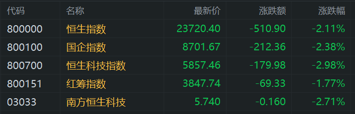 格隆汇3月10日|港股上午盘三大指数低开低走,继上周五刷新阶段新高后市场做多情绪持续谨慎。截止午盘,恒生科技指数跌2.98%表现较差,恒生指数、国企指数分别下跌2.11%及2.38%。 盘面上,作为市场风向标的大型科技股集体下跌大市承压明显,京东、美团跌超4%,阿里巴巴跌4%,腾讯跌超3%,快手、小米跌近3%,百度逆势上涨1.54%;前期热门的DeepSeek概念股、半导体股、机器人概念股大幅走低,联易融科技大跌近16%,创梦天地、金蝶国际、金山软件、中芯国际、华虹半导体均下挫;比特币跌破8.1万,加密货币现货ETF集体大跌,内房股、餐饮股、汽车股、濠赌股、航空股、家电股齐跌。 另一方面,军工股、有色金属股、煤炭股部分逆势上涨,金力永磁(300748)涨近8%,中船防务(600685)、烟煤澳大利亚皆有涨幅,此外,市场仍有超30只个股涨幅超10%。(格隆汇) (责任编辑:宋政 HN002)
