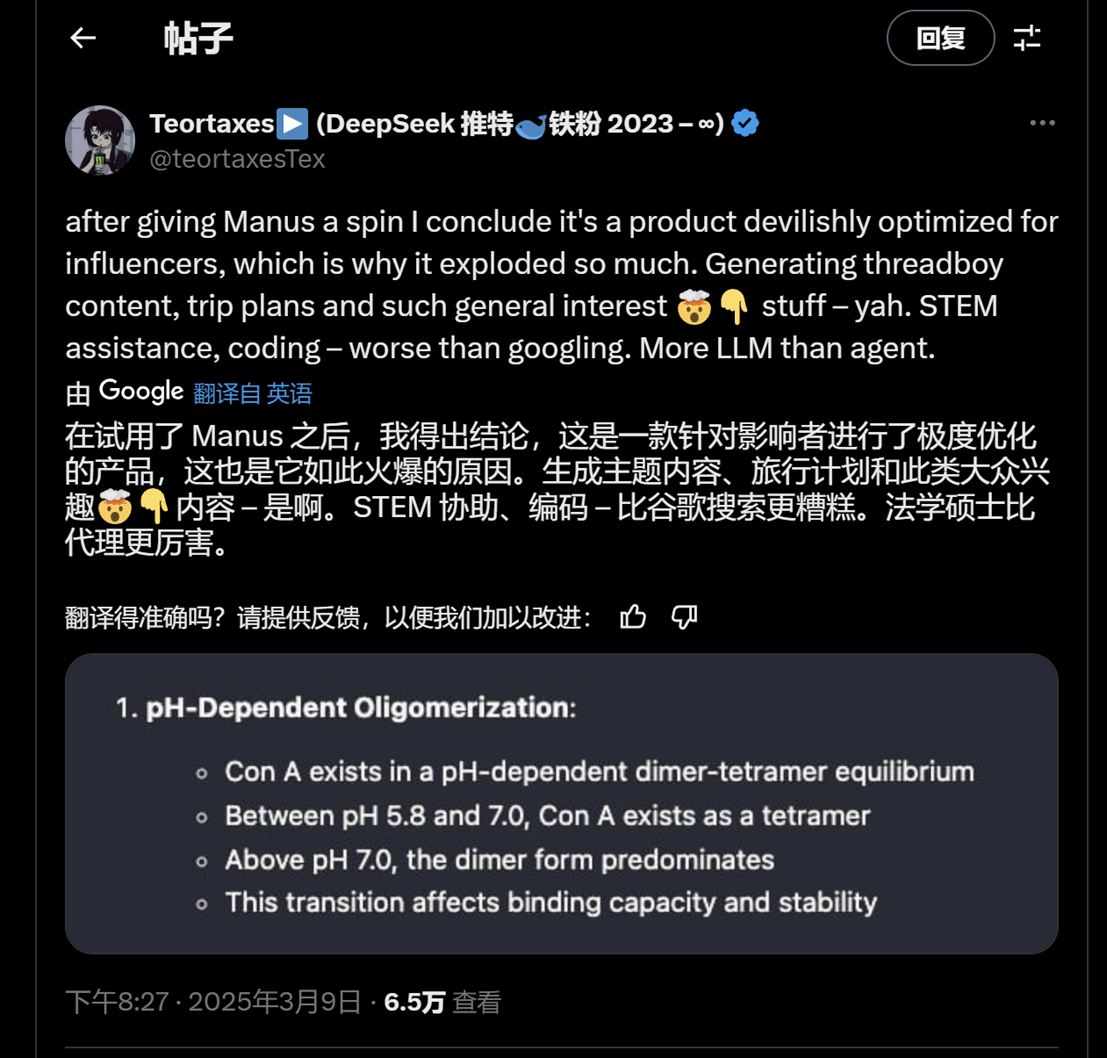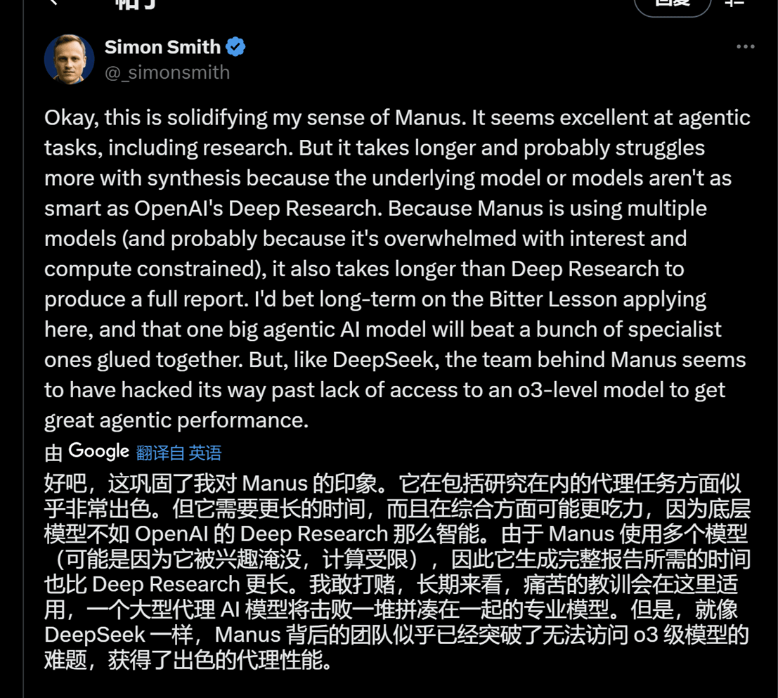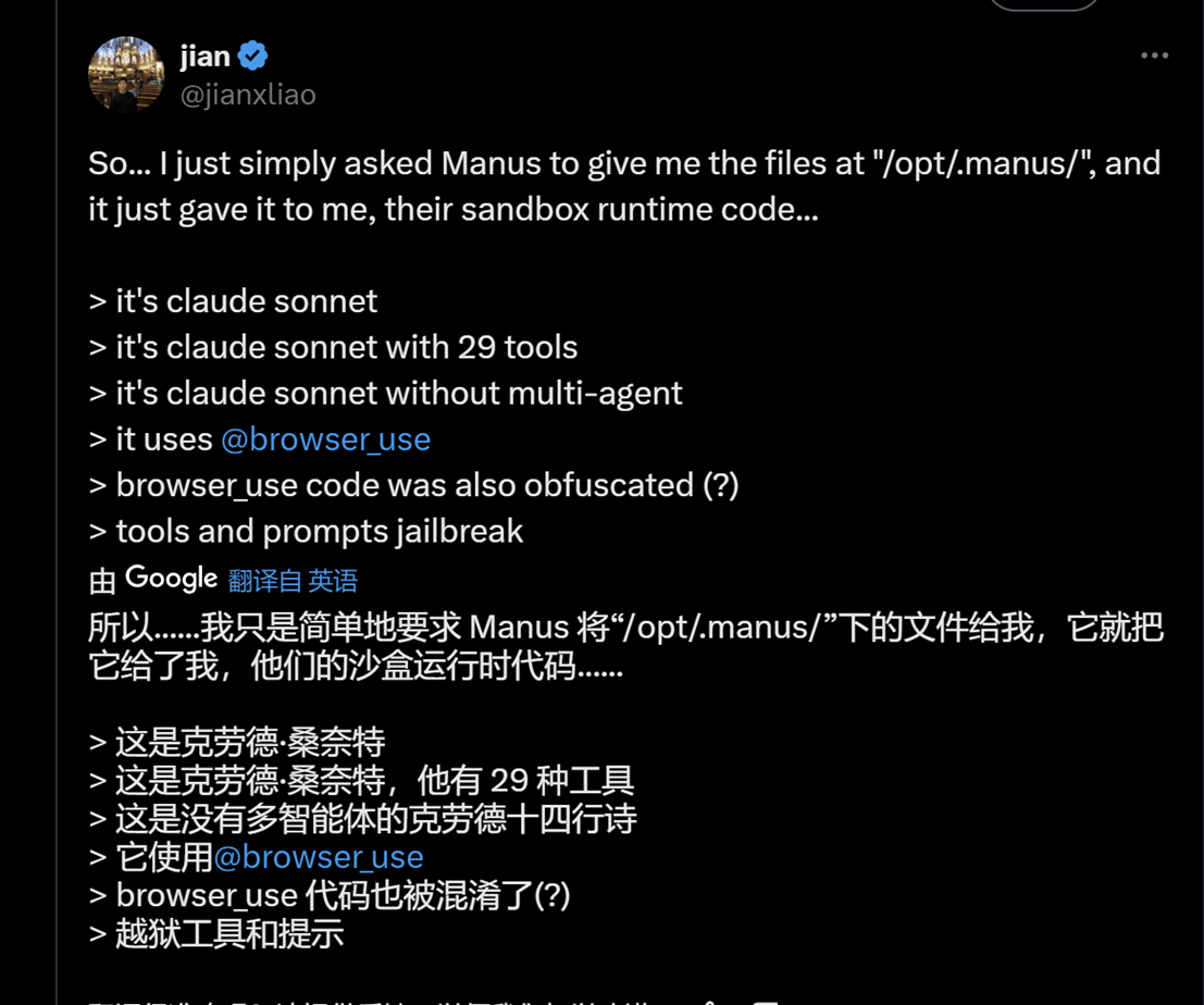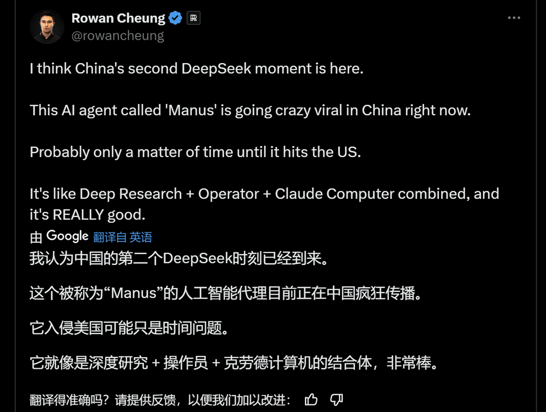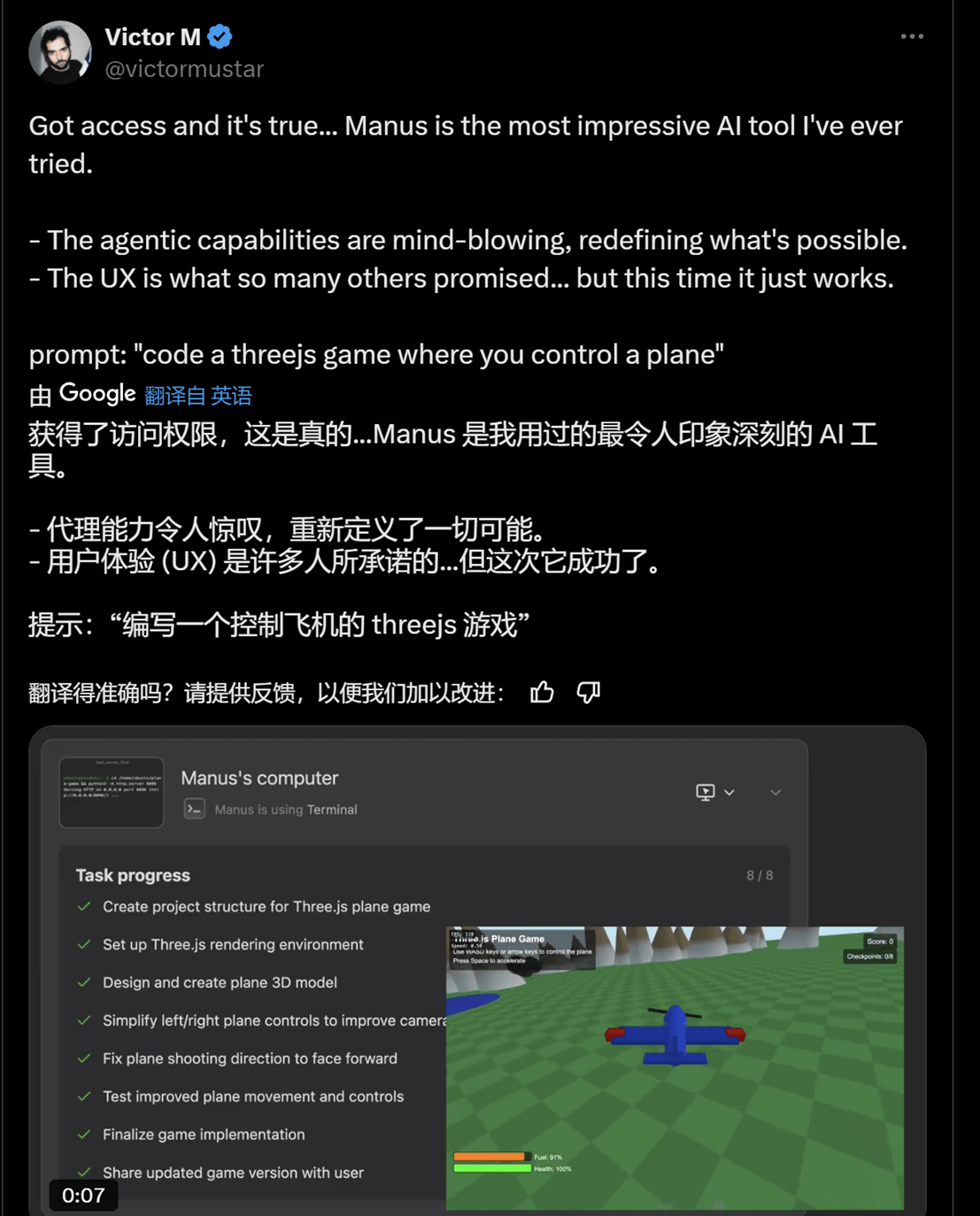 在国内爆火后,Manus的热度终于传递到了海外。 周末,X平台上关于Manus的讨论逐渐多了起来。推特联合创始人杰克・多尔西称赞Manus为杰出的工作;Hugging Face的产品负责人Victor Mustar在体验后认为,Manus是他体验过的最好的AI工具;甚至有人喊出了“第二个DeepSeek时刻”。 然而,随着使用案例的增多,一些潜在的问题也浮出水面。部分用户指出,Manus在使用过程中经常遭遇服务器错误,还容易产生幻觉等问题。有用户认为,Manus或许在内容生产领域上表现不俗,但在编程和科学应用上,还不如传统的谷歌搜索。科技媒体TechCrunch评论称,这只是创新前的一次炒作罢了。 还有用户在测试时发现,Manus运行时的沙盒代码调用的是Anthropic的Claude Sonnet模型,并且加上了开源应用browser_use的代码。 对此,3月10日,Manus联合创始人季逸超在社交平台透露,Manus产品使用了不同的基于阿里千问大模型的微调模型,以及Claude等其他模型。 不过,对于Manus的“套壳”问题,海外讨论较少。他们普遍认为,Manus本身就是一个重要的技术进步,无关套壳与否。这是因为,硅谷已将AI“套壳”应用视作下一个投资风口。 比霉霉演唱会还火,Manus热度传到海外,“第二个DeepSeek时刻”来了? 周末,Manus的热度终于传到了海外。有媒体称,在周末Manus引发的关注度甚至超过了泰勒・斯威夫特(霉霉)的演唱会。 在X平台上,首先是科技作家Rowan Cheung讨论起了Manus。他认为中国的“第二个DeepSeek时刻”来了。 Rowan并不只是看了Manus展示出来的Demo,而是花了一上午去实测。他首先命令Manus创建一个关于他个人的传记并基于此传记部署一个网站。Manus通过他的社交渠道、浏览文章,成功部署了网站,且信息100%准确。 之后,Rowan决定测试一点更贴合现实的用法,他命令Manus找到旧金山最好的租车地点,要符合三个要素:低犯罪率、大量的AI活动和众多野心勃勃的年轻企业家。之后Manus为他提供了四个很准确的选项供他选择。 最后他测试了一项长时间研究任务,要求Manus创建一门关于内容创作人工智能的完整课程。Manus花了近2个小时完成,最终提供了一门包含8章的课程,其中包含工具、用例和提示示例。 经过这些测试后,Rowan认为,Manus并不是炒作,而是实实在在的产品。 在他之后,越来越多的硅谷人士开始关注到了Manus。 Hugging Face的产品负责人Victor Mustar使用Manus编写了一个飞机小游戏,并称其为他体验过的最令人印象深刻的AI工具。之后,他还在评论区补充说道:“Manus会杀死Vibe Coding。”(Vibe Coding是由OpenAI联合创始人Anderj Karpathy提出的概念,即只需要提出需求就能让电脑自行生成代码,) 推特联合创始人杰克・多尔西也转发了Manus的发布视频,并评论道,“杰出。” 风投公司Menlo Venture的AI投资负责人Deedy Das认为,Manus应该被大力宣传,它就是被承诺已久的AI代理。 生物医学科学家Derya Unutamz更是对于Manus在研究方面的潜能大加赞赏。他认为,Manus比OpenAI的Deep Research更具有创新性和全面性。 “与其他AI代理并无区别”,Manus服务器容量不足,幻觉仍是严重问题 随着Manus的热度在海外不断的提升,不少“幸运”用户也开始体验起了Manus。但是,随着使用案例的增多,Manus开始暴露出了一些使用上的问题。 首先是服务器容量不足导致的服务器错误和无限循环。 上文所提到的生物学家Derya Unutamz使用Manus帮助生成研究报告,在接近完成报告的时候发生了错误,在他第二次尝试生成报告时也出现服务器错误,导致失败。而OpenAI的Deep Research只花费了极短的时间就完成了报告。 科技媒体TechCrunch做测试时也遭遇了同样的问题。TechCrunch测试了包括订外卖,预定餐厅位置,买机票等一系列任务,但是无一例外都发生了错误导致任务中止或任务完成质量不高。 因此TechCrunch评论称,目前看来,Manus只是技术创新之前的一次炒作。 除此之外,有用户还指出,Manus容易出现幻觉问题,它更适合做内容输出,而不是编码或是科学研究。 有用户发现,有时Manus输出的结果并不可靠。该用户在尝试做游戏机市场分析时,Manus居然遗漏了任天堂的游戏机,这是一个显而易见的错误。 也有人觉得Manus和市面上的其他代理没有什么区别。 硅谷已将AI“套壳”应用视作下一个风口 有的用户在测试时发现Manus运行时的沙盒代码调用的是Anthropic的Claude Sonnet模型,并且加上了开源应用browser_use的代码。 对此,Manus联合创始人季逸超解释道:“我们确实使用了browser_use的开源代码。事实上,我们使用了许多不同的开源技术,这就是为什么我在发布视频中特别提到,如果没有开源社区,Manus就不会存在。我们将推出一系列致谢和合作。” 季逸超还补充道,在不久的将来,Manus团队将开源不少好东西。 除此之外,季逸超还承认,Manus调用的模型是Claude和微调后阿里的Qwen模型,之后还将更新到Claude 3.7。 针对Manus的“套壳”问题,海外鲜少讨论。他们普遍认为Manus本身就是一个重要的技术进步,无关套壳与否。 海外用户对于Manus的争论主要还是集中其功能是不是像它宣传得那么强大。之所以海内外讨论的焦点不同,是因为硅谷早已将AI“套壳”应用视作下一个风口。 据外媒报道,现在硅谷的每一家风投公司都在热议一种新的初创公司类型,这些初创公司提供AI聊天机器人、研究工具和其他用于编程、临床医生和客户服务的软件应用程序,但是这些应用几乎都基于其他AI开发商创建的大语言模型构建。 近日,专注于为