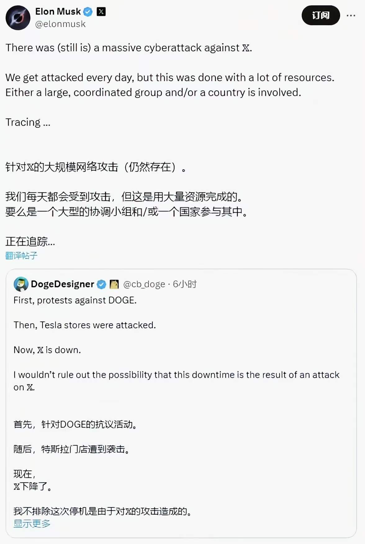 社交媒体X平台 凤凰网科技讯(作者/冯皓钦)3月11日,据悉,今日凌晨,马斯克回应了其社交媒体平台X出现故障的问题,声称这是一次针对X的大规模网络攻击。马斯克称,此次攻击耗费了大量资源,攻击方可能是一个大型的、有组织、有计划的团体,也可能是一个国家。特别的,攻击IP地址源自乌克兰地区,马斯克说。 马斯克回应 马斯克艰难的周一。据了解,除了特斯拉股价自高点腰斩之外,从当天早上开始,X平台遭遇了大规模网络攻击,出现了三次服务中断,许多用户无法正常使用该应用程序。 根据故障追踪网站Downdetector的数据,中断报告在美国东部时间早上6点左右首次出现,当时多达20538名用户反馈了故障。随后在上午9:30和11:00又出现了两次显著的中断。 DownDetector的许多用户抱怨X应用程序无法加载,而且这次宕机似乎是全球性的。DownDetector的数据是用户自己反馈的,这意味着中断规模远超报告数据。 截至目前,尚无相关方对上述袭击做出回应。 (责任编辑:贺 )