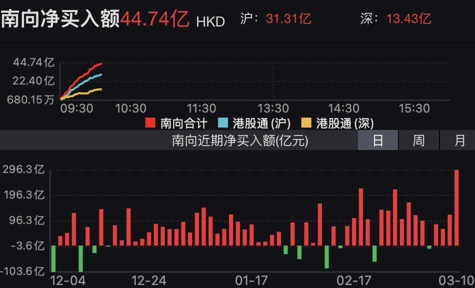 格隆汇3月11日|隔夜美股大跌,港股低开高走,恒生科技指数从跌幅2%转涨,港股科技ETF(159751)盘中翻红上涨0.65%。 消息面上,南下资金昨日净买入296.26亿港元,创历史新高,今日继续净买入港股44.74亿港元。 华泰证券(601688)指出,美国就业等数据偏弱推动近期海外流动性边际宽松,为港股带来阶段性顺风,资金面上,被动型外资加速流入港股,南向资金流入态势稳定。考虑到国内经济企稳态势显现,AI应用加速落地逻辑不改,科技龙头财报表现仍强等因素,短期视角对港股不宜悲观,中长期仍坚定看好中国资产重估行情演绎。 港股科技ETF(159751)联接基金(A:021294,C:021295,I:022884) (责任编辑:宋政 HN002)