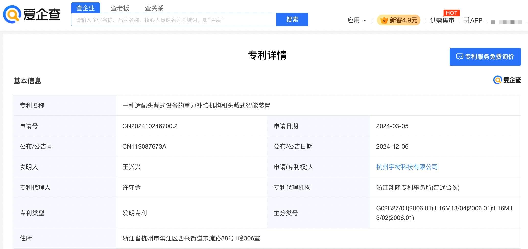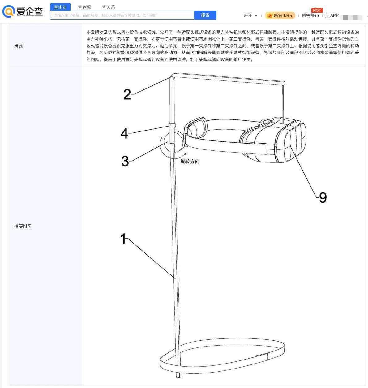 凤凰网科技讯(作者/冯皓钦)3月11日,近日,杭州宇树科技有限公司申请的“一种适配头戴式设备的重力补偿机构和头戴式智能装置”专利获授权。 图源:爱企查 据爱企查显示,该专利涉及头戴式智能设备技术领域,公开了一种适配头戴式设备的重力补偿机构和头戴式智能装置。 据悉,该专利提供的这种适配头戴式智能设备的重力补偿机构,包括第一支撑件,固定于使用者身上或使用者周围物体上;第二支撑件,与第一支撑件相对活动连接,并与第一支撑件配合为头戴式智能设备提供克服重力的支撑力;驱动单元,设于第一支撑件和第二支撑件之间,或者设于第二支撑件上;根据使用者头部竖直方向的转动趋势,为头戴式智能设备提供竖直方向的驱动力,从而达到缓解因长期佩戴的头戴式智能设备导致的头部及面部不适以及颈椎酸痛等使用体验差的问题,提高使用者对头戴式智能设备的使用体验。 图源:爱企查 (责任编辑:张晓波 )