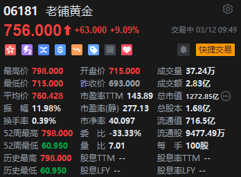 3月12日消息,老铺黄金盘初股价再度拉升一度涨超13%,现报756港元,涨9.09%,年内涨幅已达210%。 老铺黄金是2024年6月上市的次新股,专注于古法手工黄金饰品的设计、研发与销售,以精湛工艺和独特设计闻名。截至2024年6月招股书披露时,公司共有32家门店。其在港交所上市时,发行1945.13万股,发行价为40.5港元,募资净额约7.13亿港元。腾讯、南方基金、源峰基金为其3名基石投资者。 2024年上半年,老铺黄金营业收入高达35亿元(人民币,下同),同比增长148%;净利润为5.9亿元,同比增长199%;公司预计2024年净利润为14亿元―15亿元,同比增长236%―260%,超出市场预期。上市以来股价已较发行价大幅增长16倍,坐稳港股“股价一哥”。 (责任编辑:宋政 HN002)
