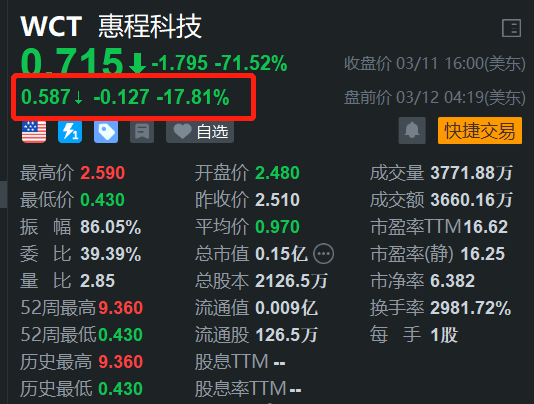 格隆汇3月12日|昨日暴跌71.5%创新低的惠程科技(WCT.US)美股盘前继续下跌17.8%,暂为表现最差中概股。公开资料显示,惠程科技(002168)来自香港,是一家专注于企业软件解决方案服务的高端供应商。从业绩来看,公司2023财年营收、净利都实现了双位数增长,不失为一家“小而美”的香港本地SaaS服务商。但值得注意的是,美股市场并不乏同样身处SaaS赛道的中概股,而目前惠程科技市盈率(TTM)已达到203.67,远超同类个股估值。(格隆汇) (责任编辑:宋政 HN002)