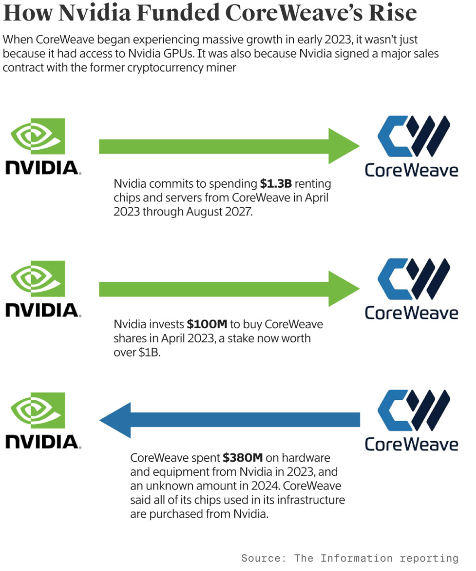 Nvidia CEO黄仁勋(左)和CoreWeave CEO Michael Intrator 凤凰网科技讯 3月12日,The Informatin发文,解析了英伟达与CoreWeave代号“鱼鹰计划”的合作。 2023年,英伟达做出了一项耐人寻味的举动:同意在四年内斥资13亿美元,向云计算新秀CoreWeave租用自家芯片。这份被CoreWeave代号为“鱼鹰计划”的协议,使英伟达成为其仅次于微软的第二大客户。该细节未出现在CoreWeave上周提交的IPO招股书中。 这份协议凸显英伟达对CoreWeave的关键支持。2023年初,这家芯片巨头向CoreWeave注资1亿美元,输送数十万颗高端GPU,并签署长达四年的芯片回租协议。该协议贡献了CoreWeave去年15%的营收。 CoreWeave计划本月以逾300亿美元估值上市。若成功,英伟达两年前的1亿美元股权投资将增值超10倍。 潜在投资者正评估CoreWeave客户集中度带来的风险。去年,微软与英伟达合计贡献其超四分之三营收,但相关合同将在2027-2029年间陆续到期。 为支撑扩张,CoreWeave已背负80亿美元债务和150亿美元长期数据中心租赁合约,亟需拓展新客户。这种"大客户依赖+高增长+重负债"的组合令估值评估充满挑战。 “从未见过增长如此迅猛却存在重大盈利模式风险的企业,”前科技高管CJ Gustafson表示,“但巨额营收能掩盖许多问题。” 本周一,CoreWeave宣布与OpenAI达成119亿美元五年期云服务协议,年均新增约20亿美元收入,此举将缓解CoreWeave对英伟达和微软的过度依赖。OpenAI表示该协议将与其微软、甲骨文云服务及软银支持的"星际之门"超算中心形成互补。 英伟达租用自有芯片的动机尚不明朗,但多重因素促成其与CoreWeave的深度绑定:既为内部研发团队获取算力资源,也通过DGX云计算服务中转租赁给客户。此前报道显示,英伟达高管担忧对AWS、微软等云巨头的过度依赖,而这些企业正自研AI芯片并挤占GPU供应。 英伟达如何资助CoreWeave崛起 对CoreWeave而言,这笔交易恰逢其时。2021年其营收几乎全部来自以太坊挖矿,2022年币价暴跌后转型影视渲染与AI算力。随着ChatGPT引爆需求,英伟达的订单加持使CoreWeave获得黑石等机构24亿美元融资,得以快速扩张数据中心。(作者/陈俊熹) (责任编辑:王治强 HF013)