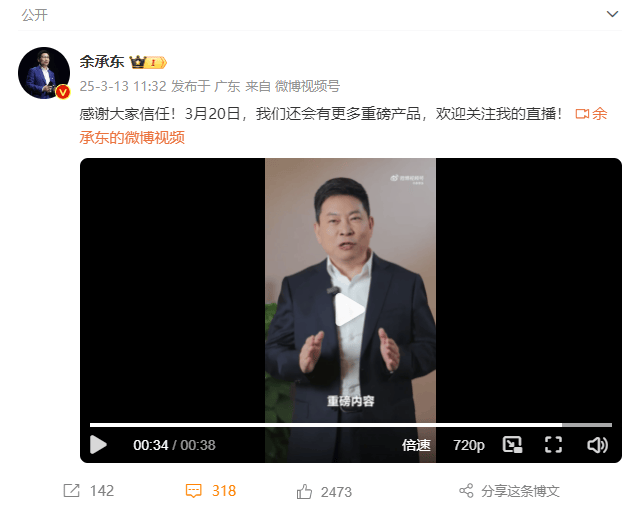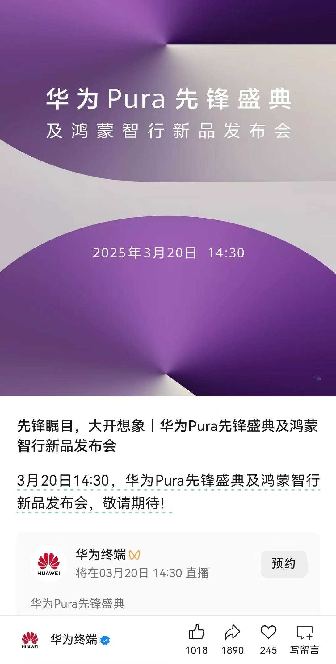 3月13日上午,华为终端官方微信号官宣将于2025年3月20日14:30正式举办华为Pura先锋盛典及鸿蒙智行新品发布会。 图片来源:华为终端官方微信号 华为常务董事、终端BG董事长、智能汽车解决方案BU董事长余承东今日也在微博称,3月20日,我们还会有更多重磅产品。 图片来源:余承东微博 3月12日早间,余承东发布视频,官宣原生鸿蒙正式版手机,称首款搭载原生鸿蒙正式版的“想不到的产品”,下周见。