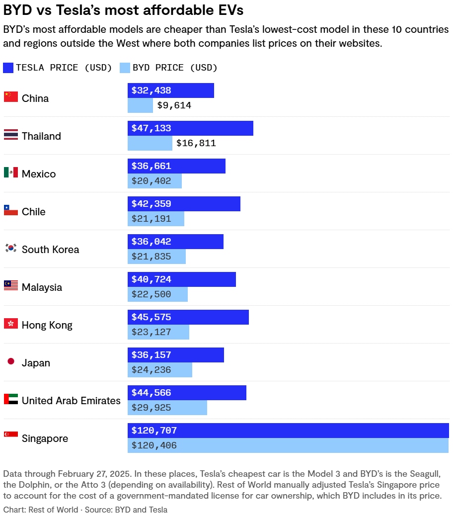 比亚迪 凤凰网科技讯 3月13日,rest of world报道,在特斯拉布局相对薄弱的非西方市场,比亚迪凭借“价格战”取得了优势。 rest of world选取了墨西哥、智利、阿联酋、中国大陆、中国香港、韩国、日本、泰国、马来西亚和新加坡等10个双方均有官方销售渠道的市场进行对比分析,结果显示,比亚迪入门级车型(海鸥、海豚或元PLUS)售价均显著低于特斯拉Model 3。 比亚迪与特斯拉最便宜车型比拼 电动汽车情报公司Rho Motion的分析师乔治・惠特科姆表示,特斯拉Model 3比比亚迪最便宜的产品更“高端”。多年来,特斯拉一直承诺但未能制造出一款低成本的入门级电动汽车。 在2024年10月的财报电话会议上,马斯克表示,该公司有望在2025年上半年推出价格实惠的车型。 与此同时,世界各地寻找经济实惠电动汽车的买家纷纷转向比亚迪等中国制造商。 据报道,比亚迪正寻求通过要求供应商降低价格来提高在中国的竞争力,同时它还希望在本土之外建立更多工厂。这样做将降低出口成本,并可能降低比亚迪的全球价格。“在中国电动汽车市场上,低成本竞争是一件大事,”惠特科姆说。“然后,随着比亚迪的全球扩张,低成本生产汽车可以带来连锁反应。”(作者/陈俊熹) (责任编辑:贺 )