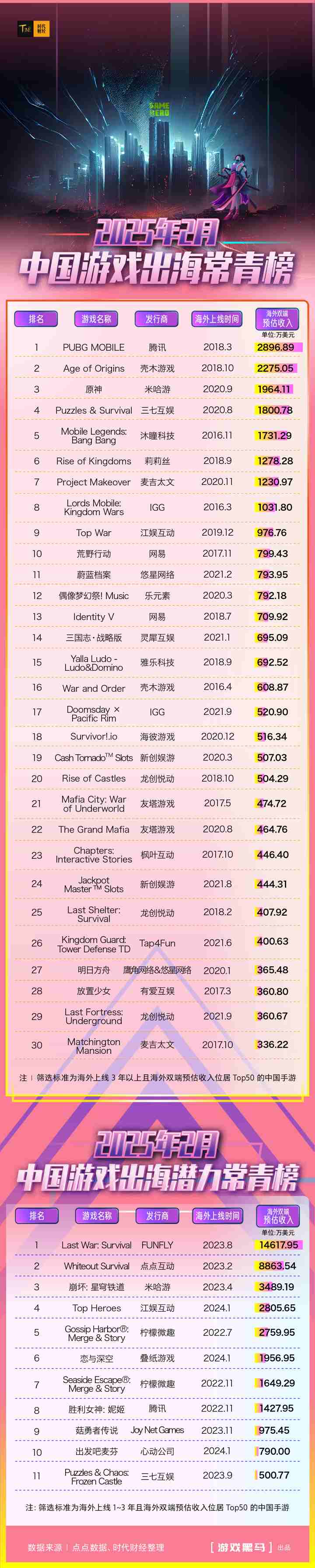 编者按:为展现中国游戏出海的整体表现与市场格局,时代财经推出了“中国游戏出海常青榜”系列。该系列从国产游戏出海的角度出发,聚焦于那些在海外市场长期保持竞争力、为中国游戏行业树立标杆的常青游戏产品,通过深入剖析这些常青游戏的成功要素,揭示其背后商业逻辑与经验,旨在为中国游戏出海提供有益的参考和借鉴。 图源:图虫 近年来,中国游戏出海呈现出蓬勃发展的态势,成为全球游戏市场中不可忽视的一股力量。 根据《2024年中国游戏出海研究报告》,2024年中国自主研发游戏海外实际销售收入同比增长13.39%至185.57亿美元(约为1298.99亿元),并成功扭转了此前连续两年海外收入下降的局面。 图源:游戏产业报告微信号 这一增长的背后,既有头部大厂的持续发力,也有中小厂商的积极布局。 头部大厂凭借多款出海常青游戏的稳定运营和内容持续更新,保持了较高的市场热度和用户活跃度;中小厂商凭借灵活的市场策略和创新的游戏玩法,在海外市场迅速崛起,成为推动增长的重要力量。 时代财经以海外上线3年以上且海外双端预估收入跻身Top50的中国手游为筛选标准,统计并发布《2025年2月中国游戏出海常青榜》(下称“《出海常青榜》”);同时以海外上线1年至3年且海外双端预估收入跻身Top50的中国手游为标准,统计并发布《2025年2月中国游戏出海潜力常青榜》(下称“《出海潜力常青榜》”)。 据统计,2月份共有《PUBG MOBILE》《Age of Origins》《原神》等30款游戏入围《出海常青榜》;同时,有《Last War: Survival》《Whiteout Survival》《崩坏:星穹铁道》等11款游戏入围《出海潜力常青榜》。 中国手游海外“百花齐放” 据时代财经统计,上榜《出海常青榜》的30款游戏2月海外双端预估收入累计达到2.64亿美元(约为18.47亿元),其中8款游戏海外双端预估收入超过1000万美元(约为7000万元)。 从游戏企业角度来看,龙创悦动旗下游戏入围最多,达到3款;网易(NTES;09999.HK)、神州泰岳(300002.SZ)旗下壳木游戏、IGG(00799.HK)、悠星网络、麦吉太文、新创娱游、友塔游戏各有2款游戏入围,呈现出中小厂商与头部大厂齐头并进的态势。 具体来看,位居前三的是《PUBG MOBILE》《Age of Origins》《原神》3款热门出海手游,2月海外双端预估收入分别达到2896.89万美元(约为2.03亿元)、2275.05万美元(约为1.59亿元)、1964.11万美元(约为1.37亿元)。 《PUBG MOBILE》是腾讯于2018年3月在海外上线的一款大逃杀类射击手游,凭借其丰富的玩法和高度的策略性,赢得全球玩家的喜爱,已然成为射击手游领域的经典之作。2025年2月,该游戏进行了正式服维护更新,推出34.1版本,更新包括地图调整、载具调整、枪械调整、新增“1对1竞技场”模式等,进一步巩固了其在游戏出海阵营中的领先地位。 而《Age of Origins》是壳木游戏于2018年10月在海外上线的一款末日题材策略塔防手游,游戏以丧尸末日为背景,玩家需要在荒废的世界中重建城市,抵御丧尸的侵袭,并与其他玩家结成联盟,争夺资源和领土。2025年2月,该游戏发布了最新版本1.3.758,对部分玩法进行了优化。 相较之下,《原神》是由米哈游于2020年9月全球同步公测的一款开放世界动作角色扮演游戏(ARPG)。游戏以“提瓦特”幻想世界为背景,玩家扮演“旅行者”角色,探索七国风貌,寻找失散的亲人。2025年2月,该游戏5.4版本“梦间见月明”上线,新五星角色梦见月・瑞希首次登场,同时复刻了五星角色希格雯。 其后,《Puzzles & Survival》《Mobile Legends: Bang Bang》2款热门出海手游位居《出海常青榜》第四、第五位,2月海外双端预估收入分别为1800.78万美元(约为1.26亿元)、1731.29万美元(约为1.21亿元)。 《Puzzles & Survival》是三七互娱于2020年8月在海外上线的一款将经典的三消解谜玩法与策略生存元素结合的游戏,不仅具有休闲游戏的轻松感,还具备策略游戏的深度和挑战性,在今年2月还与另一款知名游戏《末日堡垒》进行了联动活动。 《Mobile Legends: Bang Bang》则是沐瞳科技于2016年11月在海外上线的一款MOBA手游,以其快节奏的战斗、多样化的英雄选择和公平的竞技环境吸引了大量玩家。2025年2月是该游戏的活动高峰期,不仅有情人节活动、黄金月赠品节、鬼神传说皮肤系列,还推出了新的排位系统和赛季奖励,增加了新的匹配机制,以提升游戏的公平性。 值得注意的是,在此次《出海常青榜》前十的中国手游中,策略类手游占据“半壁江山”,除《Age of Origins》《Puzzles & Survival》两款出海手游外,还有莉莉丝《Rise of Kingdoms》、IGG《Lords Mobile: Kingdom Wars》、江娱互动《Top War》3款出海手游。 互联网产业分析师张书乐告诉时代财经,相较于其它品类的游戏,SLG(策略类)游戏更容易让国外玩家快速上手,帮助厂商打开海外市场。同时,SLG的研发和运营相对容易,可以同一内核快速换皮制作大量游戏冲击市场。 11款游戏入围出海潜力常青榜 而在上述30款出海常青游戏之外,时代财经在统计过程中发现,已有不少出海游戏展现出成为常青的潜力。它们普遍在海外上线超过一年之后,依旧维持着一定的流水表现,能在激烈的市场竞争之中,持续跻身海外双端预估收入Top50的中国手游行列。 据时代财经统计,2月份共有11款游戏入围《出海潜力常青榜》。其中,柠檬微趣旗下有2款游戏入围,而腾讯与米哈游、三七互娱、点点互动等其他中小厂商一样各有1款游戏入围。 具体来看,位居《出海潜力常