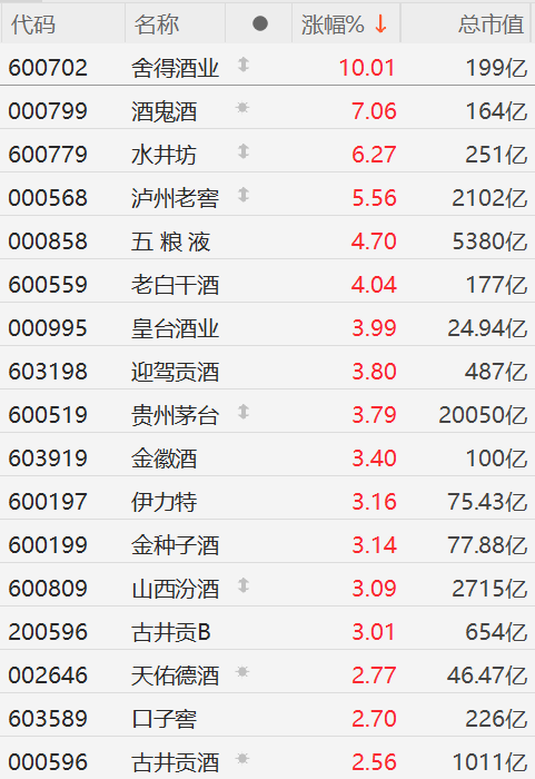 格隆汇3月14日|A股市场白酒股强势反弹,其中,舍得酒业(600702)涨停,酒鬼酒(000799)涨7%,水井坊(600779)涨超6%,泸州老窖(000568)涨超5%,五粮液(000858)、老白干酒(600559)涨超4%,皇台酒业、迎驾贡酒(603198)、贵州茅台(600519)、金徽酒(603919)、伊力特(600197)、金种子酒(600199)、山西汾酒(600809)、古井贡B涨超3%,天佑德酒、口子窖(603589)、古井贡酒(000596)、今世缘(603369)、洋河股份(002304)涨超2%。 消息面上,国务院新闻办公室将于2025年3月17日(星期一)下午3时举行新闻发布会,请国家发展改革委副主任李春临和财政部、人力资源社会保障部、商务部、中国人民银行、市场监管总局有关负责人介绍提振消费有关情况,并答记者问。 投行瑞银近日的研报也指出,人工智能(AI)概念股在港股表现突出,而A股则相对滞后。但相信随着政府政策更加倾向消费,中国A股有追赶上涨的潜力,并将最偏好行业从互联网转向消费股。(格隆汇) (责任编辑:宋政 HN002)