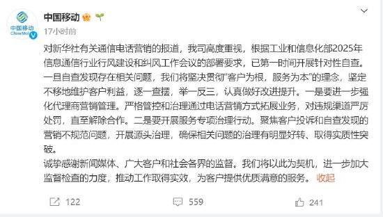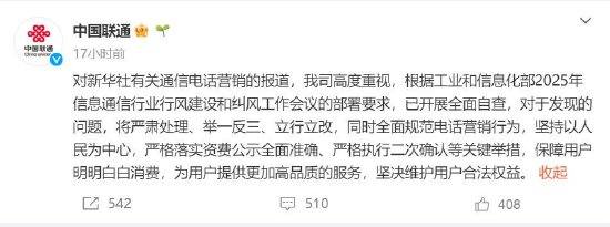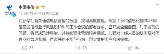 仟茂科技讯 3月17日上午消息,新华社近日发布《通信营销电话藏了多少“坑”?》的报道,指出通信套餐“免费升级”“限时优惠”……这些被消费者视为优惠的广告,不知不觉中却暗藏套路。“新华视点”记者调查发现,通信行业电话营销花样百出,诱导升级、隐性扣费等现象依然存在。 三大运营商集体在官微发布声明称,已开展全面自查。中国移动在官微表示,对新华社有关通信电话营销的报道,我司高度重视,根据工业和信息化部2025年信息通信行业行风建设和纠风工作会议的部署要求,已第一时间开展针对性自查。一旦自查发现存在相关问题,我们将坚决贯彻“客户为根,服务为本”的理念,坚定不移地维护客户利益,逐一查摆,举一反三,认真做好改进提升。一是要进一步强化代理商营销管理。严格管控和治理通过电话营销方式拓展业务,对违规渠道严厉处罚,直至解除合作。二是要开展服务专项治理行动。聚焦客户投诉和自查发现的营销不规范问题,开展源头治理,确保相关问题的治理有明显好转、取得实质性突破。诚挚感谢新闻媒体、广大客户和社会各界的监督。我们将以此为契机,进一步加大监督检查的力度,推动工作取得实效,为客户提供优质满意的服务。 中国电信表示,对新华社有关通信电话营销的报道,我司高度重视,根据工业和信息化部2025年信息通信行业行风建设和纠风工作会议的部署要求,已开展全面自查,对于发现的问题,将坚决迅速整治。并持续强化营销服务规范,加强对一线人员的培训及对代理商的管理监督,严肃惩处不规范行为,切实维护用户合法权益。 中国联通表示,对新华社有关通信电话营销的报道,我司高度重视,根据工业和信息化部2025年信息通信行业行风建设和纠风工作会议的部署要求,已开展全面自查,对于发现的问题,将严肃处理、举一反三、立行立改,同时全面规范电话营销行为,坚持以人民为中心,严格落实资费公示全面准确、严格执行二次确认等关键举措,保障用户明明白白消费,为用户提供更加高品质的服务,坚决维护用户合法权益。 (责任编辑:宋政 HN002)