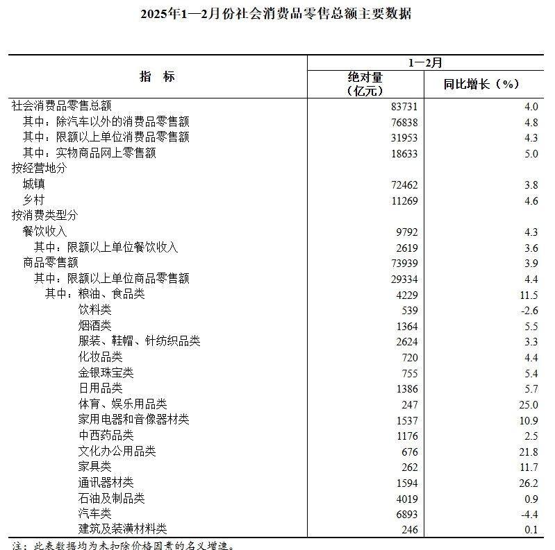 格隆汇3月17日|中国1-2月社会消费品零售总额83731亿元,同比4%,预期4%,前值3.7%。按消费类型分,1-2月份,商品零售额73939亿元,同比增长3.9%;餐饮收入9792亿元,增长4.3%。 (责任编辑:宋政 HN002)
