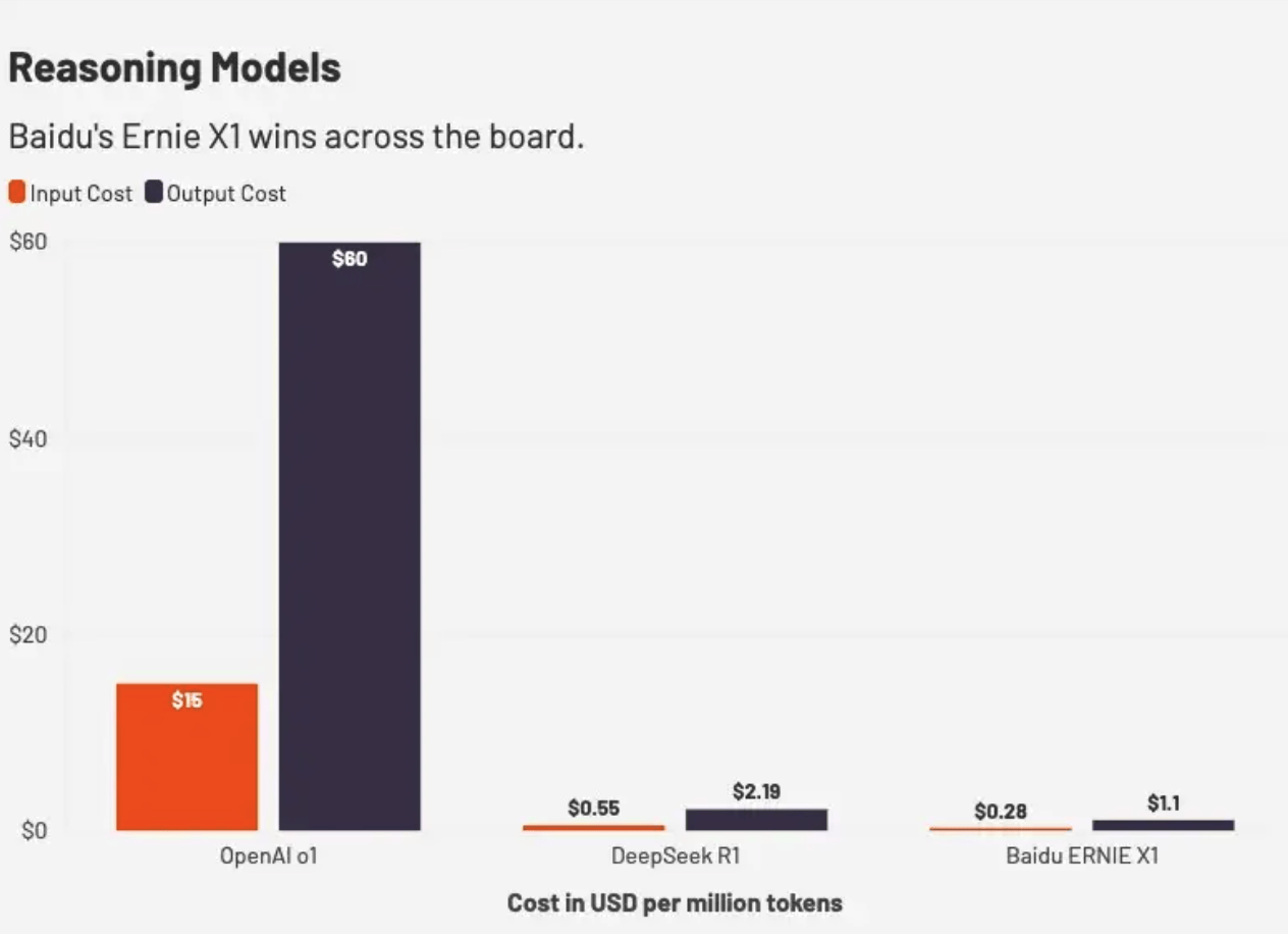 图1:百度发布文心大模型4.5 凤凰网科技讯 北京时间3月17日,百度在上周日发布了文心大模型4.5和推理模型X1,再次引起了美国媒体对于大模型成本的关注。为此,《商业内幕》专门拿百度的新模型与DeepSeek、OpenAI进行了对比。结果发现,OpenAI大模型的调用价格要比百度、DeepSeek贵出一大截。 百度称,文心大模型4.5是其首个原生多模态大模型,在多项测试中表现优于GPT4.5,API调用价格仅为GPT4.5的1%。X1为深度思考模型,性能对标DeepSeek-R1,调用价格约为R1的一半。 去年12月,DeepSeek发布了大语言模型V3,并在今年1月推出了推理模型 R1。根据伯恩斯坦研究公司的分析,这些模型在性能上与OpenAI 的同类模型相当甚至更优秀,但价格“便宜20-40倍”。 中美三大公司对比 Tokens是AI模型处理中的最小数据单位。企业会根据模型处理时的输入Tokens数量和生成的输出Tokens数量来定价。 以文心4.5大模型为例,它的输入价格为0.004元/千tokens,输出0.016元/千tokens,约为GPT4.5价格的1%。 图2:基础模型价格对比 《商业内幕》把百度和DeepSeek的模型定价转化为每百万输入/输入tokens的美元价格,发现百度文心4.5大模型的定价确实只有GPT4.5的大约1%,但它仍高于DeepSeek V3。 在推理模型方面,文心X1的定价是最便宜的,不到OpenAI o1模型的2%。 图3:推理模型价格对比 抛开使用成本不谈,那些已经试用过文心大模型的人似乎都对它印象深刻。风投公司Zero2Launch风投合伙人阿尔文・胡(Alvin Foo)在X表示:“已经体验了几个小时,表现令人印象深刻。” 另外,百度还在拥抱开源,计划把文心大模型4.5开源。“我们从DeepSeek身上学到一点是,将最为优秀的模型开源供所有人使用,将可以极大地推动其应用,因为大家出于好奇自然会想去尝试开源模型,进而推动其更广泛的应用。”百度CEO李彦宏在2月份的电话会议上表示。(作者/箫雨) (责任编辑:董萍萍 )