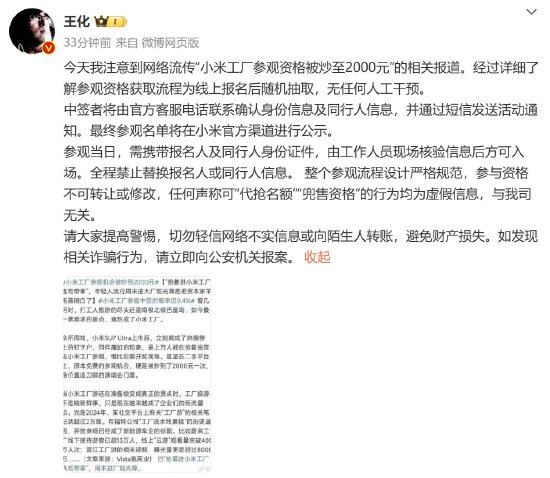 仟茂科技讯 3月20日下午消息,今日,小米集团公关部总经理王化在其微博发文称,网络流传“小米工厂参观资格被炒至2000元”的相关报道。经过详细了解参观资格获取流程为线上报名后随机抽取,无任何人工干预。并表示:任何声称可“代抢名额”“兜售资格”的行为均为虚假信息,与我司无关。 王化表示,中签者将由官方客服电话联系确认身份信息及同行人信息,并通过短信发送活动通知。最终参观名单将在小米官方渠道进行公示。 参观当日,需携带报名人及同行人身份证件,由工作人员现场核验信息后方可入场。全程禁止替换报名人或同行人信息。 整个参观流程设计严格规范,参与资格不可转让或修改,任何声称可“代抢名额”“兜售资格”的行为均为虚假信息,与我司无关。 请大家提高警惕,切勿轻信网络不实信息或向陌生人转账,避免财产损失。如发现相关诈骗行为,请立即向公安机关报案。(罗宁) 责任编辑:何俊熹 (责任编辑:郭健东 )