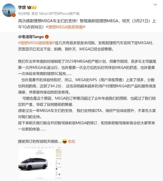 仟茂科技讯 3月20日下午消息,理想汽车CEO李想在其个人微博发文表示,智驾焕新版理想MEGA,将于3月21日上午10点上线官网。 此前,李想本人发文谈理想MEGA一周年时表示:理想MEGA要感谢很多人,但最需要感谢的是理想MEGA的用户们,是你们的坚定让我们感受到信心,是你们的分享让我们感受到鼓舞,是你们的回应让我们感受到了力量!理想MEGA会不断迭代,我们坚信它一定会成为最好的家庭MPV,没有之一。 据悉,理想纯电MPV车型MEGA于去年3月上市,售价55.98万元。理想汽车CEO李想曾表示,MEGA将是理想汽车下一个爆品,有信心成为50万元以上乘用车销量第一的产品。然而,MEGA自发布以来就饱受争议和质疑。去年11月21日,理想MEGA汽车1万台下线,去年12月22日,理想MEGA全月累计定单首次突破1000台,理想汽车第一产品线总裁汤靖称“经历了挺长一段的艰难的时期”。(罗宁) 责任编辑:何俊熹 (责任编辑:郭健东 )