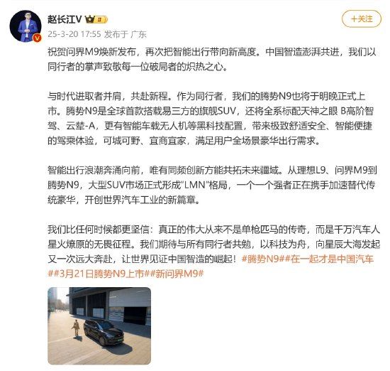 仟茂科技讯 3月20日下午消息,今日,比亚迪腾势销售事业部总经理在微博发文表示,为今天刚刚上市的 2025 款问界 M9 送上祝贺:“祝贺问界 M9 焕新发布,再次把智能出行带向新高度。中国智造澎湃共进,我们以同行者的掌声致敬每一位破局者的炽热之心。” 他还表示,作为同行者,我们的腾势N9也将于明晚正式上市。腾势N9是全球首款搭载易三方的旗舰SUV,还将全系标配天神之眼 B高阶智驾、云辇-A,更有智能车载无人机等黑科技配置,带来极致舒适安全、智能便捷的驾乘体验,可城可野、宜商宜家,满足用户全场景豪华出行需求。智能出行浪潮奔涌向前,唯有同频创新方能共拓未来疆域。从理想L9、问界M9到腾势N9,大型SUV市场正式形成“LMN”格局,一个一个强者正在携手加速替代传统豪华,开创世界汽车工业的新篇章。我们比任何时候都更坚信:真正的伟大从来不是单枪匹马的传奇,而是千万汽车人星火燎原的无畏征程。我们期待与所有同行者共勉,以科技为舟,向星辰大海发起又一次远大奔赴,让世界见证中国智造的崛起。(罗宁) 责任编辑:刘万里 SF014 (责任编辑:郭健东 )