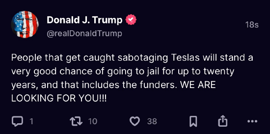 特朗普在社交媒体发文表示,那些被抓到破坏特斯拉的人将极有可能面临至多20年的监禁,这也包括资助者。
