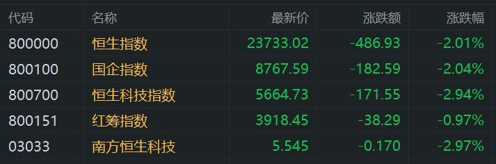 格隆汇3月21日|港股上午盘三大指数继续昨日大幅回调行情,半导体、汽车等热门板块皆大幅走低,市场情绪降至低点。截止午盘,恒生科技指数跌2.94%表现最弱,恒生指数、国企指数分别下跌2.01%及2.09%,恒指失守24000点。 盘面上, 作为市场风向标的大型科技股持续下跌,快手跌近5%,小米跌3.5%,阿里巴巴跌超3%,网易、百度、腾讯、京东皆下跌;大金融股(银行、保险、券商)、中字头股等权重集体表现低迷;汽车股、半导体股跌幅较为明显,连创新高的比亚迪(002594)股份大跌7%,北京汽车发盈警更是跌超13%,半导体股龙头中芯国际亦跌近7%,DeepSeek概念股、机器人概念股、内房股、航空股、濠赌股、餐饮股、光伏股、港口航运股、重型基建股纷纷下跌。 另一方面,电信股部分逆势上涨,中国移动、中国联通(600050)涨超1%,机构指全国水泥均价连续回升,建材水泥股普遍上涨,利好政策加持,中医药股多数呈现上涨行情。(格隆汇) (责任编辑:宋政 HN002)