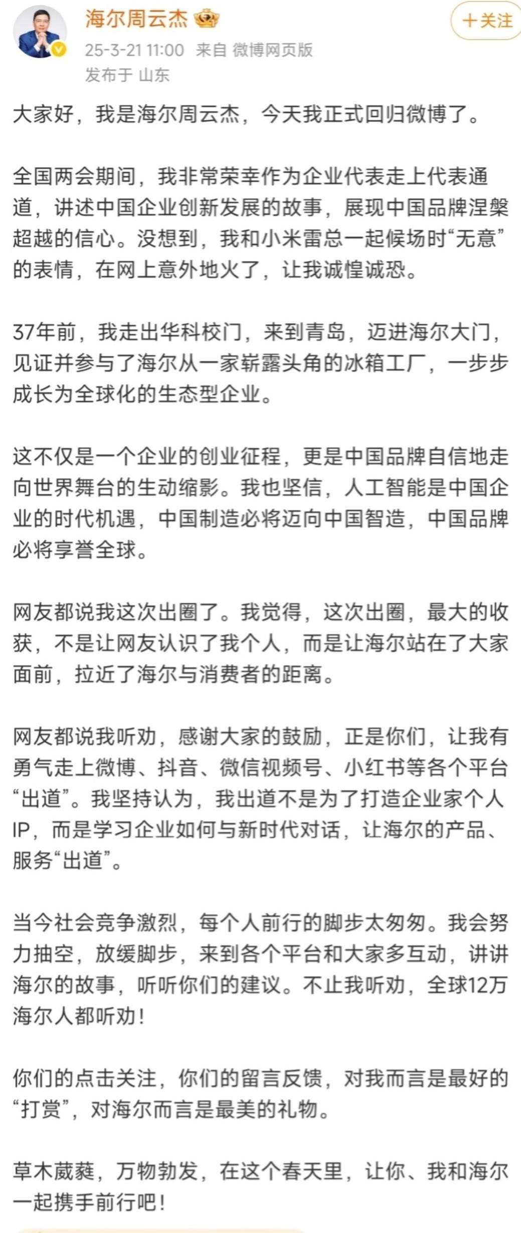 凤凰网科技讯 (作者/彭坤苹)3月21日,海尔周云杰正式宣布回归微博,其动态引发网友关注。周云杰表示,全国两会期间,我非常荣幸作为企业代表走上代表通道,讲述中国企业创新发展的故事,展现中国品牌涅超越的信心。没想到,我和小米雷总一起候场时“无意”的表情,在网上意外地火了,让我诚惶诚恐。 他表示,网友都说我听劝,感谢大家的鼓励,正是你们,让我有勇气走上微博、抖音、微信视频号、小红书等各个平台“出道”。我坚持认为,我出道不是为了打造企业家个人 IP,而是学习企业如何与新时代对话,让海尔的产品、服务“出道”。 对于周云杰回归微博,小米雷军公开表达欢迎,周云杰随即回应:“谢谢雷总,初来乍到,请多关照。” (责任编辑:董萍萍 )