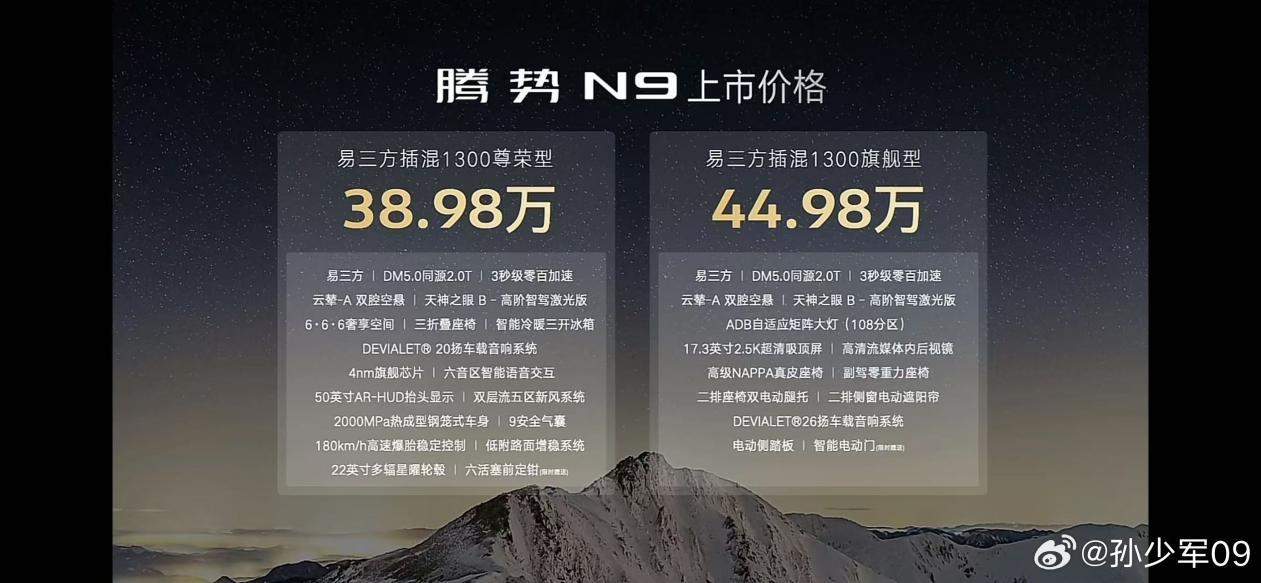 凤凰网科技讯 3月21日,比亚迪集团在深圳举办发布会,宣布子品牌腾势的旗舰大型SUV车型N9正式上市,提供2种配置可选,官方指导价分别为尊荣型38.98万元,旗舰型44.98万元。 作为腾势品牌的旗舰SUV,腾势N9配备天神之眼B-高阶智驾激光版(DiPilot 300)、云辇-A智能空气车身控制系统,基于易三方平台打造的,搭载了由2.0T发动机和三电机组成的插混系统,发动机最大功率152kW,前电机最大功率200kW,两台后电机最大功率均为240kW。同时配备46.992kWh的磷酸铁锂电池组,WLTC亏电综合油耗7.29L/100km,纯电动续航165km。 尺寸方面,腾势N9的长宽高分别为5258/2030/1830毫米,轴距3125毫米。相比于问界M9的5230/1999/1800毫米,轴距3110毫米;理想L9的5218/1998/1800毫米,轴距3105毫米略有优势。车漆颜色方面,腾势N9提供玄Z墨、雪玉莹、烟晶灰和翠华瑶四种配色可选。 内饰采用腾势家族化造型,提供有三幅式多功能方向盘、全液晶仪表盘、悬浮式中控屏、副驾驶娱乐屏以及电子怀挡,还提供电子外后视镜、灵鸢智能车载无人机系统的选装配置。 座椅方面采用了2+2+2的六座布局,第二排座椅支持向两侧移动,方便第三排乘客上下车,全车座椅均支持电动调节功能,第三排座椅支持坐垫高低调节,此外还提供吸顶式娱乐屏以及小桌板。 (责任编辑:郭健东 )