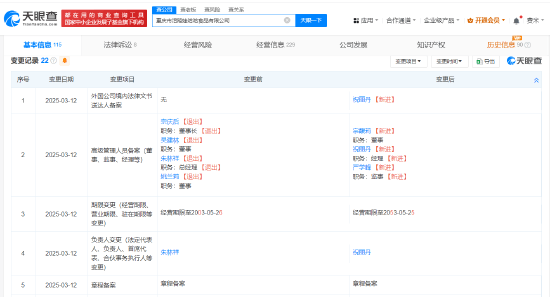 仟茂科技讯 3月24日上午消息,天眼查App显示,近日,重庆市涪陵娃哈哈食品有限公司发生工商变更,宗庆后卸任董事长,朱林祥卸任法定代表人,由祝丽丹任法定代表人、经理,宗馥莉任董事,同时多位主要人员也发生变更。 重庆市涪陵娃哈哈食品有限公司成立于2003年5月,注册资本250万美元,经营范围为生产销售饮料、保健食品等,由浙江真宗投资有限公司、Bountiful Gold Trading Limited共同持股。(罗宁) (责任编辑:宋政 HN002)