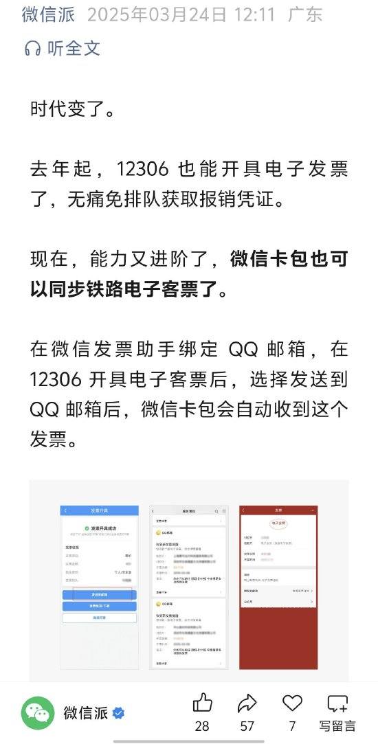 仟茂科技讯 3月24日午间消息,今日微信官方公众号“维新派”发布消息表示,微信卡包能力升级,可以同步铁路电子客票。 据悉,用户只需在微信发票助手绑定 QQ 邮箱,在 12306 开具电子客票后,选择发送到 QQ 邮箱后,微信卡包会自动收到这个发票。(罗宁) 责任编辑:韦子蓉 (责任编辑:张晓波 )