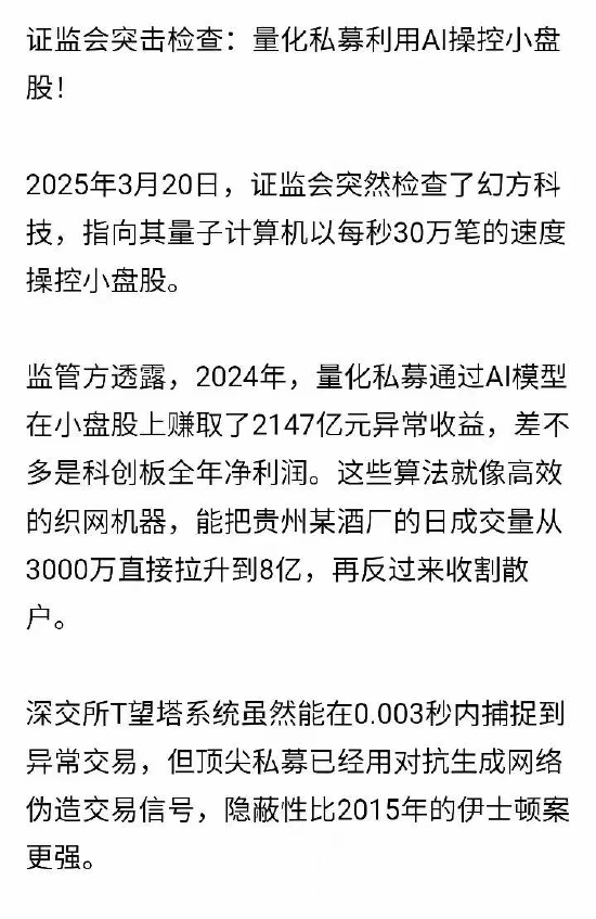 3月24日消息,近期有消息称“监管突击检查,量化私募利用AI控盘小盘股”,对此, 知情人士回应“假的!没有成本的造谣”。