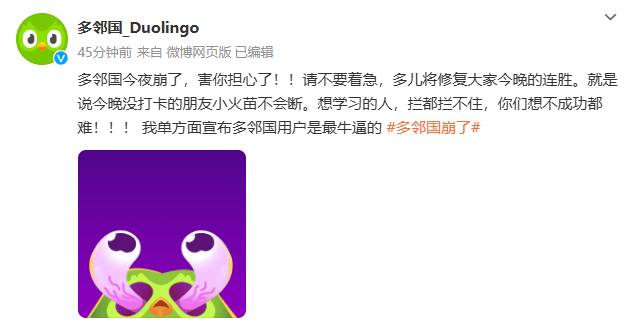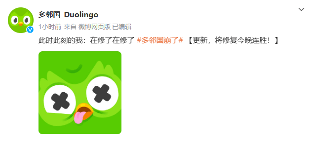 凤凰网科技讯 3月25日,语言学习平台多邻国昨日突发大规模服务中断事件引发关注。3月24日晚间,大量用户发现APP持续显示“加载中……”界面无法正常使用,#多邻国崩了#话题迅速登上微博热搜榜首,话题阅读量三小时内突破1.2亿次。部分用户误以为是设备故障,在社交平台表示“重启手机五次仍无法进入课程界面”。 针对用户对学习数据丢失的担忧,@多邻国_Duolingo 于当晚21时通过微博作出紧急回应:“在修了在修了”,两小时后追加公告承诺“将修复大家今晚的连胜”,该表态迅速获得超3万用户点赞。有网友在评论区建议“补偿会员天数”,相关提议获6000余次互动。 据最新财报显示,这款拥有42种语言课程的APP全球月活用户已达1.1亿,日活跃用户同比激增54%至3720万,付费订阅用户规模突破860万。高速增长的用户基数与服务器承载能力之间的平衡问题,或将成为多邻国下一步发展的关键挑战。 (责任编辑:董萍萍 )