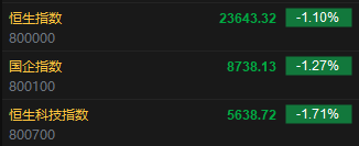3月25日消息,美股周一大幅反弹,市场对关税措施忧虑舒缓,加上大型科技股走势向好,大市高开后持续向上,三大指数均录得显著升幅收市。美元走势向好,美国十年期债息回升至4.33厘水平,金价反复回落,油价表现向上。 今日港股三大指数集团低开,恒生指数跌1.1%,报23643.32点,恒生科指跌1.71%,国企指数跌1.27%。盘面上,科网股全体下跌,小米集团跌超5%,美团、哔哩哔哩、阿里巴巴、快手跌超1%;综合车企股普跌,小米集团、小鹏汽车领跌;机器人概念活跃,盛业涨超3%。 (责任编辑:宋政 HN002)