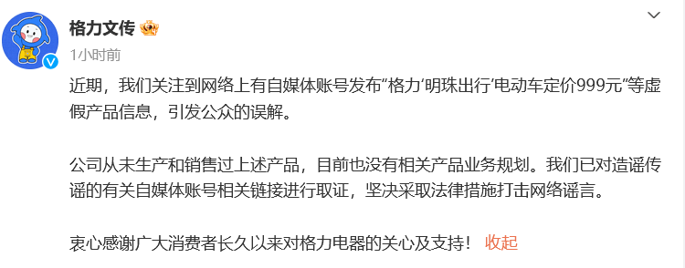 凤凰网科技讯 (作者/彭坤苹)3月24日,针对此前网传的“‘明珠出行’电动车基础款定价999元”,格力官方进行辟谣说明:公司从未生产和销售过上述产品,目前也没有相关产品业务规划。 @格力文传 发布辟谣微博称,我们已对造谣传谣的有关自媒体账号相关链接进行取证,坚决采取法律措施打击网络谣言。衷心感谢广大消费者长久以来对格力电器的关心及支持! (责任编辑:董萍萍 )