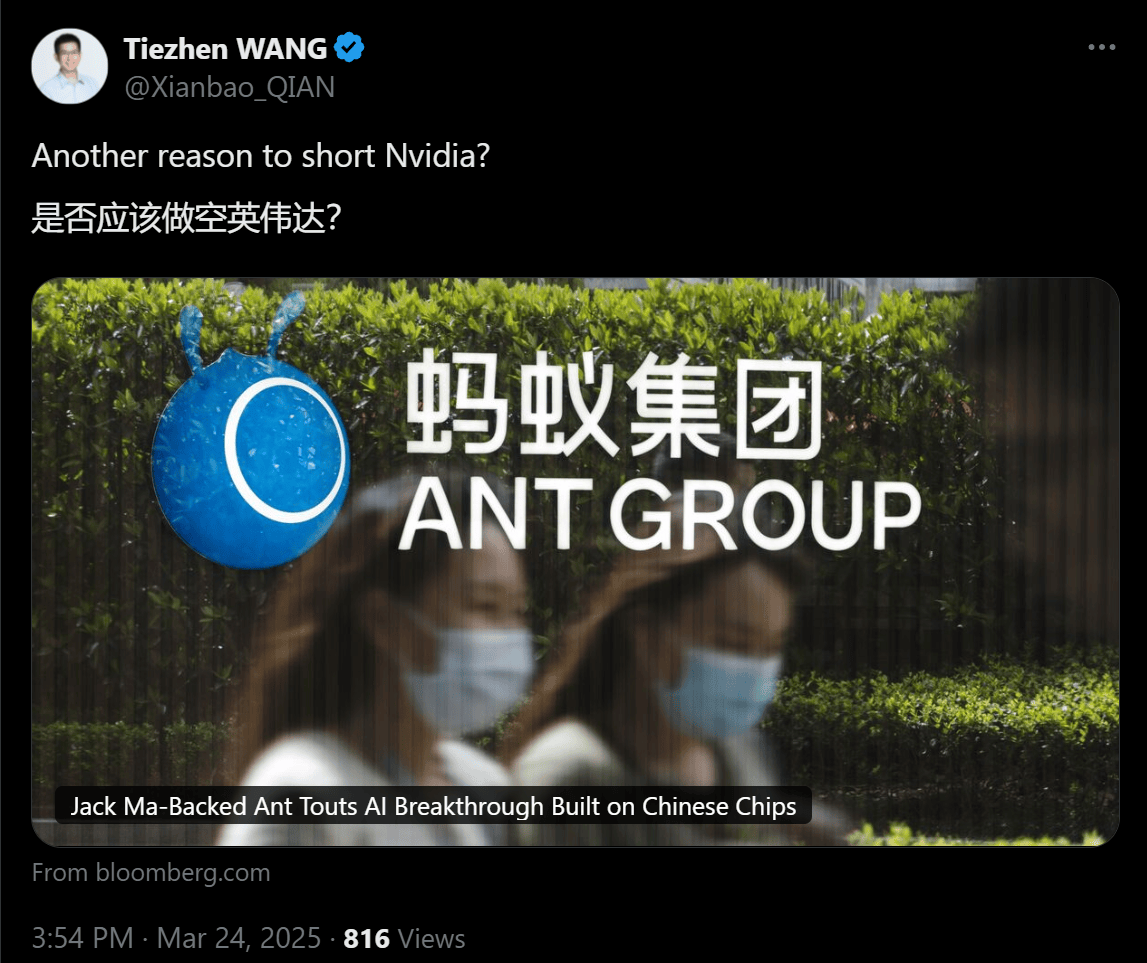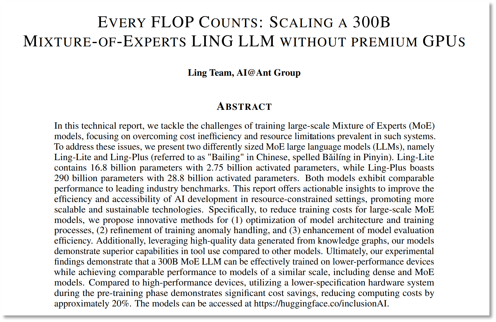 长久以来,英伟达凭借高性能芯片构筑起“算力霸权”,在AI模型训练领域占据主导地位。这一局面在DeepSeek问世后遭遇到不小的冲击,如今又面临着新的挑战。 3月初,由蚂蚁集团首席技术官何征宇带领的Ling团队发表了一篇技术成果论文。 论文显示,该团队开发了两款百灵系列开源混合专家(MoE)模型Ling-Lite(总参数为16.8B)和Ling-Plus(总参数为290B)。相比之下,据《麻省理工科技评论》,GPT-4.5总参数为1.8T,DeepSeek-R1总参数为671B。 而惊艳之处在于,Ling团队在模型预训练阶段使用较低规格的硬件系统,将计算成本降低约20%,训练1万亿Token成本从635万元降至508万元,最终取得了与使用高性能芯片(如英伟达H100、H800等)的模型相当的效果。 蚂蚁集团有关人士告诉《每日经济新闻》记者,在模型训练过程中,他们既使用了国产芯片,也采用了英伟达芯片。 但百灵系列混合专家模型的横空出世,让市场再次质疑英伟达的“算力信仰”。HuggingFace工程师Tiezhen Wang在社交媒体上表示,“做空英伟达的又一理由?” Tom's Hardware发表评论称,蚂蚁集团此次的技术突破清晰展现出中国正坚定地朝着技术独立方向迈进。 针对此事,3月24日蚂蚁集团回应媒体称,蚂蚁针对不同芯片持续调优,以降低AI应用成本,目前取得了一定的进展,也会逐步通过开源分享。 图片来源:蚂蚁集团Ling团队最新论文 蚂蚁重大突破:不使用高端GPU的情况下将计算成本降低20%目前,蚂蚁集团Ling团队的技术成果论文《每一个FLOP都至关重要:无需高级GPU即可扩展3000亿参数混合专家LING大模型》已发表在预印本平台arXiv上。 蚂蚁Ling团队认为,正如DeepSeek开源发布中分析的“昼夜推理负载不均”问题,在推理服务高峰期,高性能资源同样面临短缺。在长期科研实践中,许多机构都持续面临着高端AI加速卡供应不足的问题。相比之下,性能较低的加速器更易获得,且单价更低。因此,模型需要能在异构计算单元和分布式集群间切换的技术框架,同时在AI Infra部分,在跨集群、跨设备的兼容和可靠层面进行性能优化。 该团队的实验结果表明,参数规模为300B左右的混合专家模型可以在性能较低的设备上有效训练,并在性能上达到与同规模的其他模型相当的水平。 以Ling-Plus模型为例,在实验中,该模型在五种不同硬件配置下完成9万亿Token的预训练任务。经测算,使用高性能硬件设备训练1万亿Token,预计成本高达635万元人民币,而使用低规格硬件系统,成本则可控制在约508万元,节省近20%。 图片来源:蚂蚁集团Ling团队最新论文 在英语理解能力上,Ling-Lite模型在一项关键基准测试中的表现与Qwen2.5-7B相当,优于Llama3.1-8B和Mistral-7B-v0.3。 在中文理解能力上,Ling-Lite和Ling-Plus模型表现明显优于海外模型Llama3.1-8B和Mistral-7B-v0.3。在部分基准测试中,Ling-Plus表现略优于DeepSeek-V2.5,与Qwen2.5-7B相当。 在数学和代码基准测试方面,Ling-Lite的表现与Qwen2.5-7B-Instruct相当,优于Llama3.1-8B和Mistral-7B-v0.3。Ling-Plus的表现优于DeepSeek-V2.5,接近Qwen2.5-72B的水平。 图片来源:蚂蚁集团Ling团队最新论文 在工具使用方面,大多数情况下,Ling-Plus和Ling-Lite在基准测试中均取得了最佳成绩。而工具使用对于大语言模型来说是一项重要且具有挑战性的任务。工具使用能力使模型能够作为AI代理工作、控制机器人系统并与众多软件工具集成。 此外,在安全性方面,Ling-Plus和Qwen2.5-7B表现突出,而Ling-Plus在错误拒绝方面表现更佳。 提高大模型的无害性(harmlessness)通常会导致其有用性(helpfulness)的降低。测试结果表明,Ling-Plus在安全性和错误拒绝之间整体平衡性上表现最佳。 据悉,蚂蚁百灵大模型Ling-Plus和Ling-Lite将计划开源,并应用于医疗、金融等行业领域。 打破英伟达“算力霸权”?有分析称,百灵系列混合专家模型的推出标志着蚂蚁集团加入AI领域的竞赛。自DeepSeek展示出能够以远低于OpenAI和谷歌投入的数十亿美元成本训练出强大模型以来,这一竞争加速升级。 此前,DeepSeek在技术论文中表示,DeepSeek-V3模型(总参数671B,激活参数37B)总训练成本为557.6万美元,完整训练消耗了278.8万个GPU小时,几乎是同等性能水平模型训练所需的十分之一,堪称“榨干”GPU,也因此引发了资本市场的恐慌。 对此,英伟达CEO黄仁勋在公开场合多次赞美DeepSeek,但其认为,DeepSeek-R1等更高效的模型出现,反而会刺激计算需求增长。 然而,蚂蚁集团正在探索一条新的路径――在无高端GPU的情况下扩展模型训练能力。 百灵系列混合专家模型的横空出世,让市场再次质疑英伟达的“算力信仰”。HuggingFace工程师Tiezhen Wang在社交媒体上表示,“做空英伟达的又一理由?” 图片来源:X 著名硬件媒体Tom's Hardware指出,如果蚂蚁集团此次技术突破意味着实现了(与DeepSeek)类似的AI训练效率飞跃,这极有可能成为(中国)降低对西方技术依赖进程中的又一重要里程碑。 蚂蚁集团有关人士告诉《每日经济新闻》记者,在模型训练过程中,他们既使用了国产芯片,也采用了英伟达芯片。 Tom's Hardware发表评论称,蚂蚁集团此次技术突破清晰展现出中国正坚定地朝着技术独立方向迈进。 彭博资深商业智能分析师罗伯特・李(Robert Lea)同样指出,蚂蚁集团的研究展示了中国在AI创新方面的快速进步,也显示出本土企业正朝着AI自给自足的方向迈进。 每日经济新闻 (责任编辑:郭健东 )