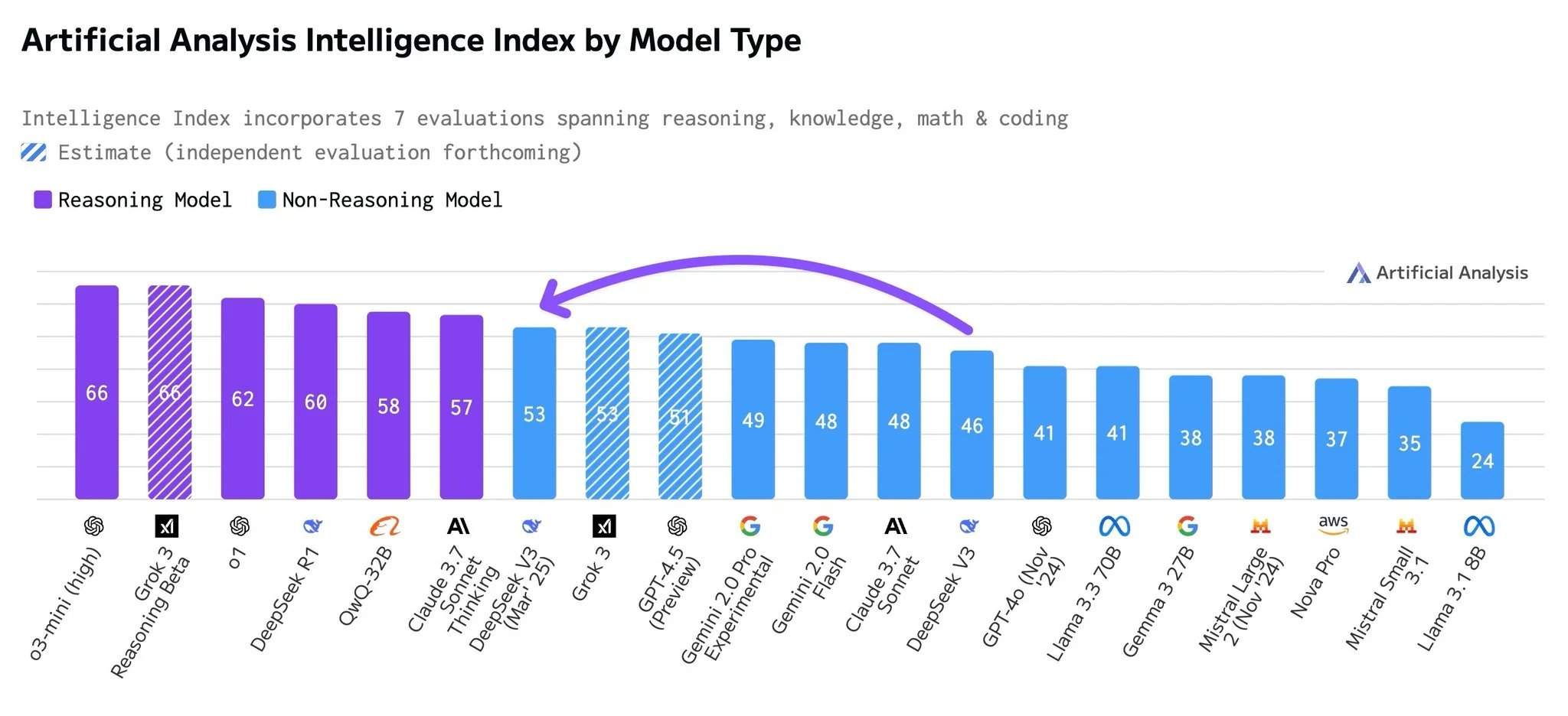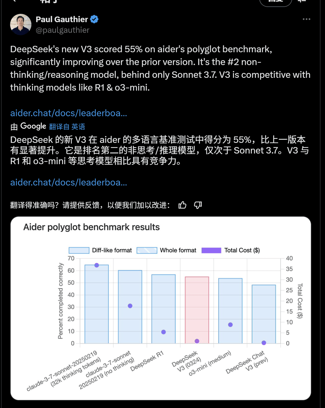 北京时间3月24日晚间,DeepSeek悄然将DeepSeek-V3模型的最新版本上传到了开源平台HuggingFace。 新模型的版本号为DeepSeek-V3-0324,参数为6850亿,较初代V3版本的6710亿有小幅增长。 尽管DeepSeek十分低调,但还是有不少人在第一时间就注意到了这一更新,并对其进行了测试。 根据社区测试反馈,DeepSeek-V3-0324最明显的变化是编程能力得到了极大的提升。众多开发者基于对新模型的综合体验判断,新模型的编程能力已经接近目前最强编程模型Claude 3.7 Sonnet。 3月25日,专业AI模型评测机构Artificial Analysis发布的最新排名显示,新版V3在基准测试中较老版V3跃升了7位,排名所有非推理模型中的第一名。 《每日经济新闻》记者实测后发现,DeepSeek-V3-0324的编程能力确实强大,但仍会出现幻觉问题。 有外媒推测:“V3新版本的推出时机和特点强烈表明,它将成为DeepSeek-R2的基础,后者是一款新的推理模型,预计在未来两个月内推出。这遵循了DeepSeek的既定模式,即基础模型比专门的推理模型早几周推出。” 机构:新版V3排名非推理模型第一 当地时间3月25日,专业AI模型评测机构Artificial Analysis在评测完新版V3后发推表示,这对开源来说是一个里程碑,因为这是开放权重模型首次成为领先的非推理模型。新版V3在他们的基准测试中跃升了7位,为所有非推理模型中的第一名。 图片来源:Artifical Analysis 虽然它在能力上仍落后于众多推理模型,但这并不能影响这一成就的重要性。因为非推理模型相较于推理模型在速度上具有优势,它可以立即回答,而无需花时间“思考”。 AI编码工具aider开发者保罗・高蒂尔对其进行了多语言基准测试,得分为55%,较上一个版本有显著提升。他认为,新版V3是仅次于Claude 3.7 Sonnet的非推理模型了,并且它比R1和o3-mini这样的推理模型更具竞争力,因为它的费用更便宜。