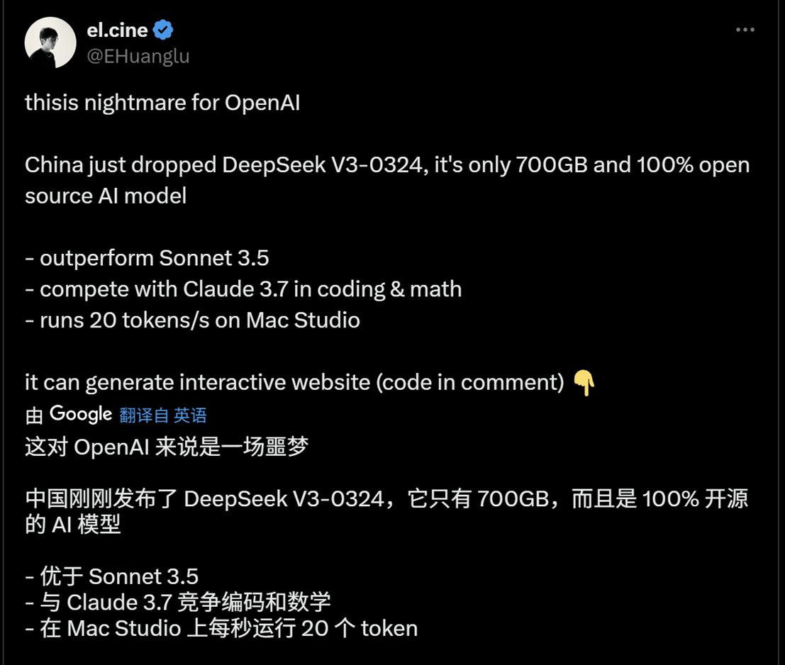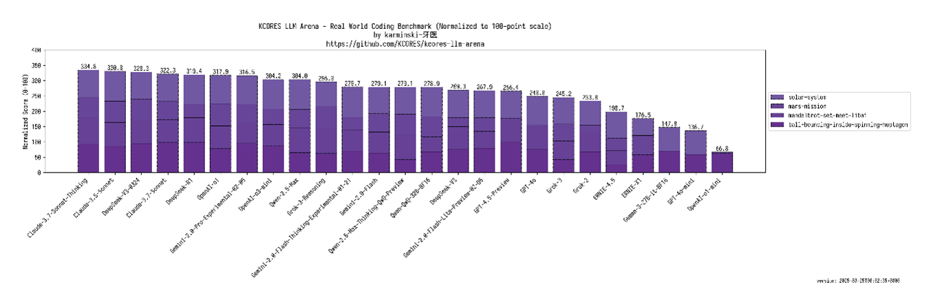 图片来源:X 开源大模型评测项目Kcores大模型竞技场的最新测试数据显示,新版V3的代码能力达到了328.3分,仅次于Claude 3.7 Sonnet(思考模型)和Claude 3.5(因不同测试之间题目不同,所以测试结果会有偏差)。