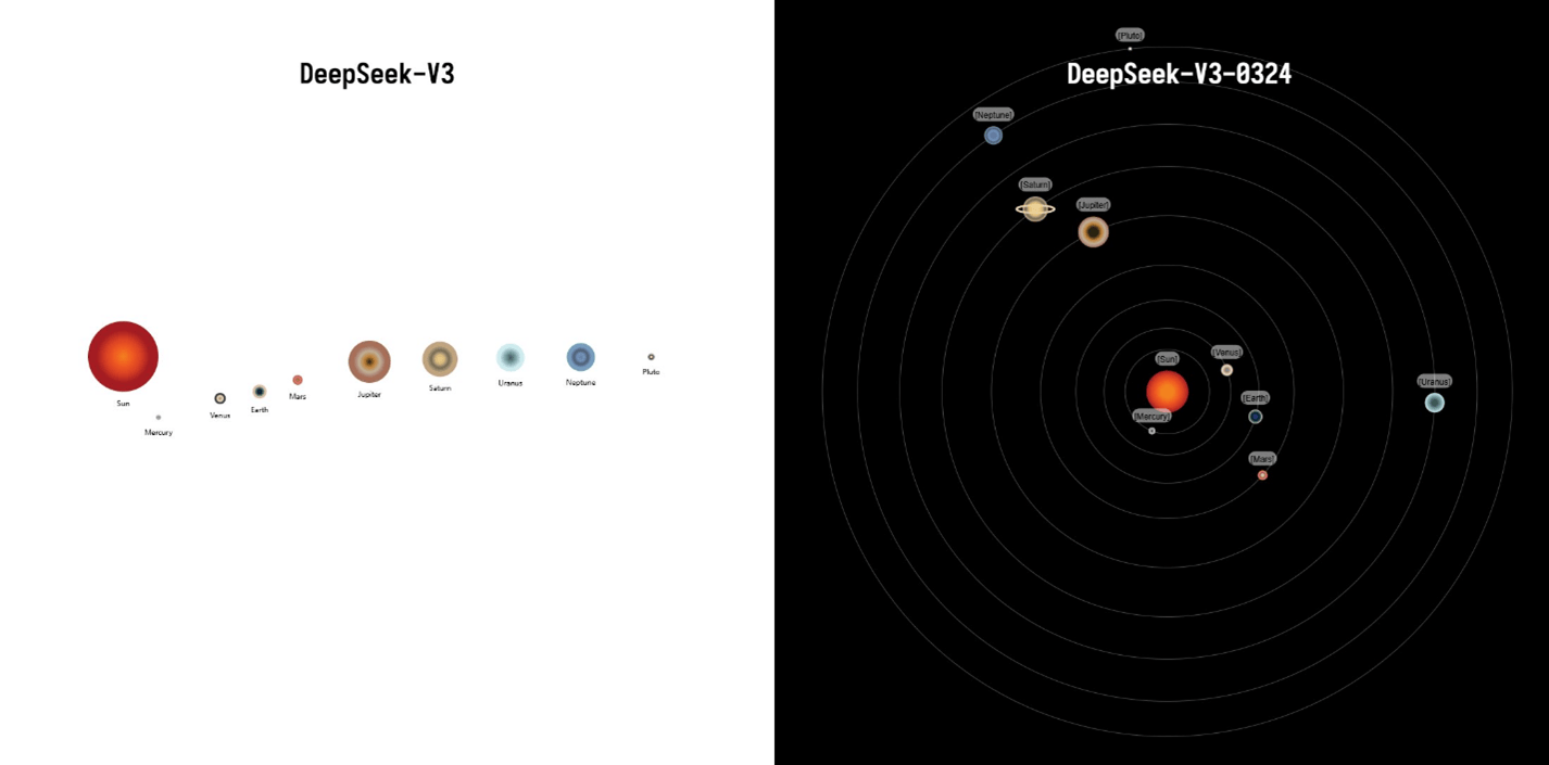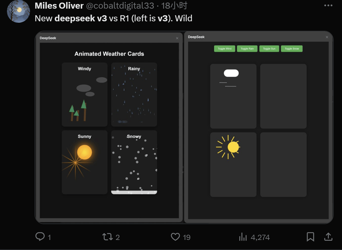 图片来源:Kcores大模型竞技场 在Kcores大模型中的四个测试中,新版V3都展示了出色的能力,特别是在九大行星模拟测试中,它是测试的25个模型中,唯一一个画了土星环的大模型。 图片来源:Kcores大模型竞技场 记者实测新版V3编程能力:完成度高,难掩幻觉问题 截至目前,DeepSeek并没有放出DeepSeek-V3-0324的跑分结果。 不过,广大网友对其进行了独立测试。在众多用户的体验中,最常被提到的就是新版V3的代码能力。 有网友同时比较了新版V3和R1之间的编程能力,要求: “创建一个包含CSS和JavaScript的单个HTML文件,以生成一个动画天气卡片。卡片应通过不同的动画直观地表示以下天气条件: 风:(例如,移动的云朵、摇曳的树木或风线) 雨:(例如,落下的雨滴、形成的水坑) 晴:(例如,闪耀的光线、明亮的背景) 雪:(例如,落下的雪花、积雪)并排显示所有天气卡片。 卡片应具有深色背景。在此单个文件中提供所有 HTML、CSS 和 JavaScript 代码。JavaScript 应包含一种在不同天气条件之间切换的方法(例如,一个函数或一组按钮),以演示每种天气的动画。” 从下图可以发现,两者生成的效果可谓天差地别。 左侧为新版V3,右侧为R1 图片来源:X 每经记者也对新版V3进行了测试,请它生成一个可以互动的、介绍世界风光的网站前端。 DeepSeek的响应过程十分丝滑,只花了2分钟就完成了,生成的网站配有日间/夜间模式切换、评论区、评分系统、收藏系统和社媒分享系统。 不过需要指出的是,在一些细节上DeepSeek还是出现了幻觉问题,比如在介绍马丘比丘时配上了和其毫无相关的图片,在介绍长城时张冠李戴地配上了故宫的图片。但整体的网站完成度还是值得点赞的。 网友热评:对OpenAI如同噩梦,对DeepSeek-R2寄予厚望 还有网友综合体验下来表示,新版V3的提升幅度大约相当于Sonnet 3.5到Sonnet 3.6的提升。 有国外网友直呼,这对OpenAI来说就是一场噩梦。 图片来源:X 有外媒表示:“V3新版本的推出时机和特点强烈表明,它将成为DeepSeek-R2的基础,后者是一款新的推理模型,预计在未来两个月内推出。这遵循了DeepSeek的既定模式,即其基础模型比专门的推理模型早几周推出。” Artificial Analysis表示,此版本可以说比R1更令人印象深刻,并且可能表明R2将是另一个重大飞跃。 Kocres联合创始人“karminski牙医”在测试完新版V3后表示:“DeepSeek-V3新版本的能力十分可怕,甚至这还都不是DeepSeek-V4,更不是DeepSeek-R2!我现在十分期待DeepSeek-R2的发布了!” 国外知名AI评论员“chubby”表示,这个小更新比预期的要大很多,因此我们对DeepSeek-R2寄予厚望。R2会成为有史以来最重要的开源推理模型。 有Reddit用户指出:“这与DeepSeek在圣诞节前后发布V3并在几周后发布R1的方式一致。据传R2将于4月发布。” 如果DeepSeek-R2遵循R1发布的轨迹,它可能会对OpenAI的下一个旗舰模型GPT-5构成直接挑战。此前,阿尔特曼在访谈中表示,GPT-5很快就会和大家见面。 每日经济新闻 (责任编辑:王治强 HF013)